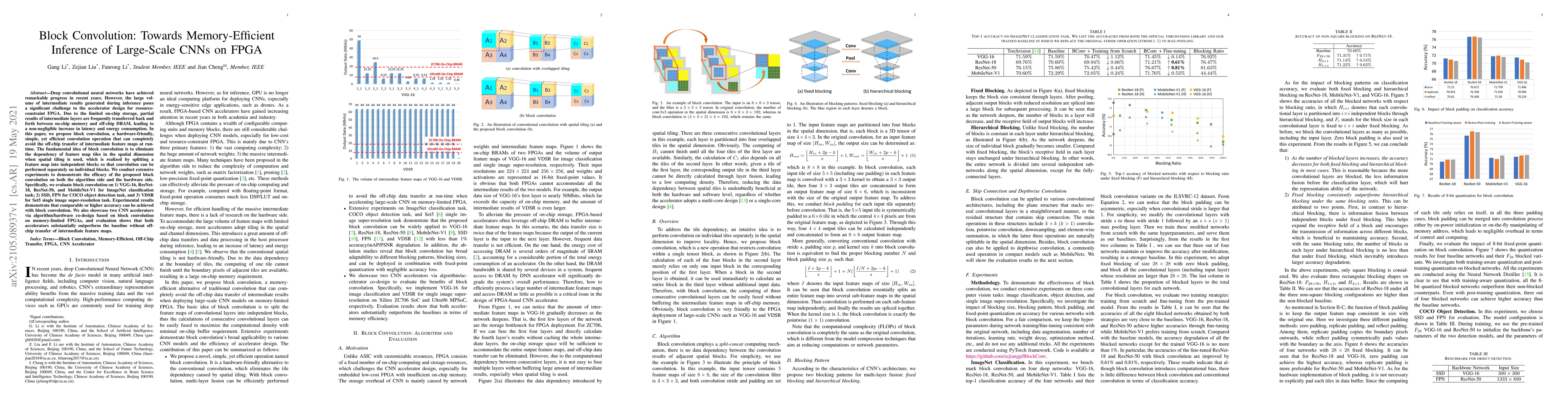 This paper proposes block convolution to enhance memory efficiency for large-scale CNNs on FPGAs by avoiding off-chip transfers of intermediate feature maps, thus reducing latency and energy consumption. Experiments on various CNN architectures show comparable or higher accuracy, and FPGA accelerators based on block convolution outperform baselines.