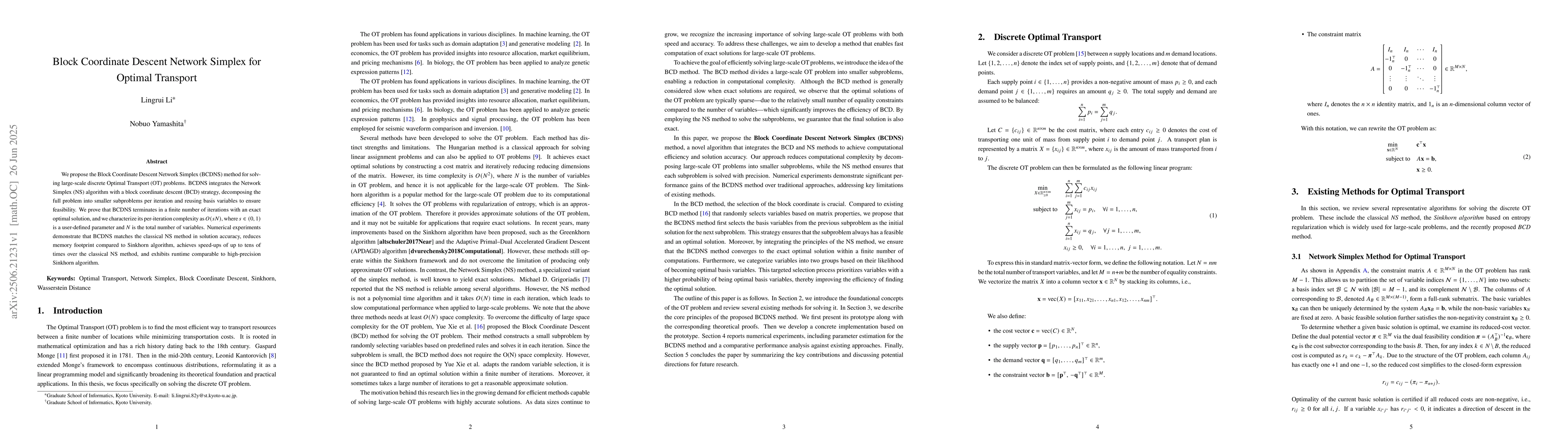 The work introduces a novel combination of block coordinate descent with the Network Simplex method tailored for optimal transport, along with a basis variable succession strategy that ensures global optimality and finite termination.