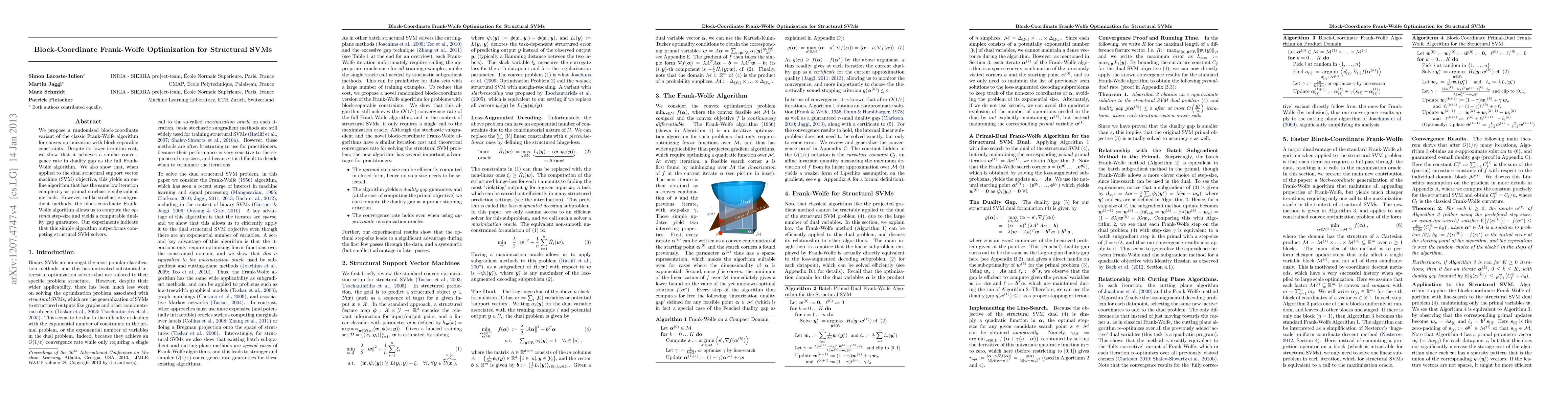 This paper introduces a randomized block-coordinate Frank-Wolfe algorithm for convex optimization with block-separable constraints, demonstrating comparable convergence rates to the full Frank-Wolfe method. When applied to structural SVMs, it provides an online algorithm with lower iteration complexity than stochastic subgradient methods, while also offering optimal step-size computation and a duality gap guarantee, outperforming other structural SVM solvers in experiments.