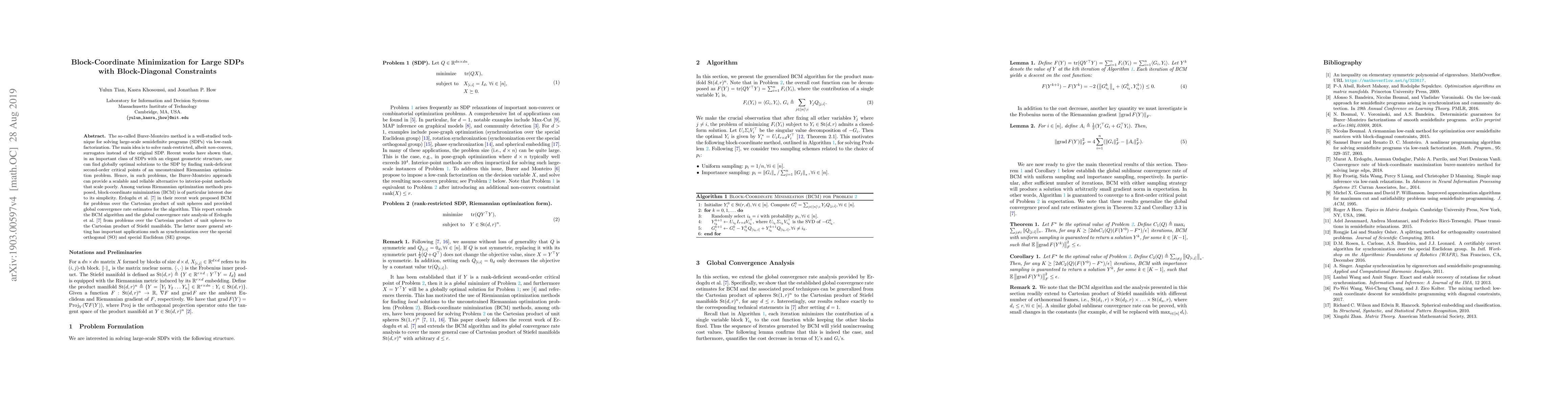 The so-called Burer-Monteiro method is a well-studied technique for solving large-scale semidefinite programs (SDPs) via low-rank factorization. The main idea is to solve rank-restricted, albeit non-convex, surrogates instead of the SDP. Recent works have shown that, in an important class of SDPs with elegant geometric structure, one can find globally optimal solutions to the SDP by finding rank-deficient second-order critical points of an unconstrained Riemannian optimization problem. Hence, in such problems, the Burer-Monteiro approach can provide a scalable and reliable alternative to interior-point methods that scale poorly. Among various Riemannian optimization methods proposed, block-coordinate minimization (BCM) is of particular interest due to its simplicity. Erdogdu et al. in their recent work proposed BCM for problems over the Cartesian product of unit spheres and provided global convergence rate estimates for the algorithm. This report extends the BCM algorithm and the global convergence rate analysis of Erdogdu et al. from problems over the Cartesian product of unit spheres to the Cartesian product of Stiefel manifolds. The latter more general setting has important applications such as synchronization over the special orthogonal (SO) and special Euclidean (SE) groups.