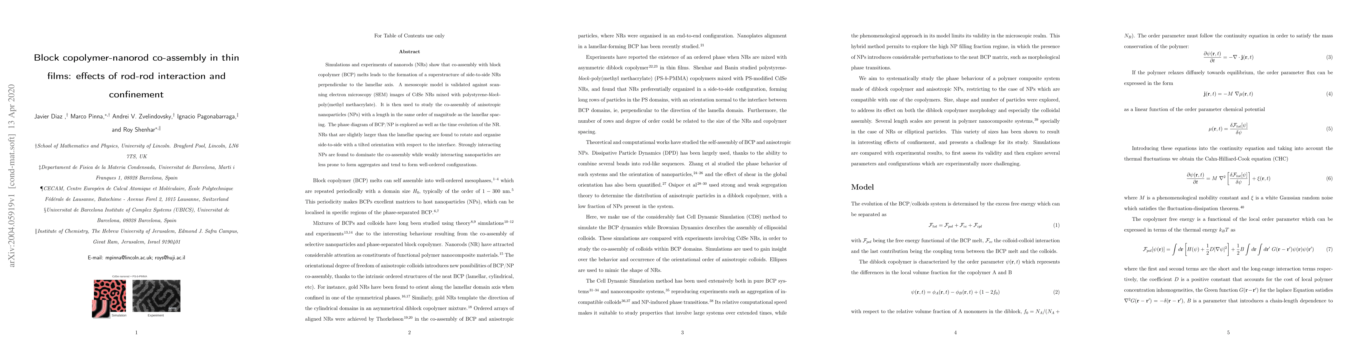 Simulations and experiments of nanorods (NRs) show that co-assembly with block copolymer (BCP) melts leads to the formation of a superstructure of side-to-side NRs perpendicular to the lamellar axis. A mesoscopic model is validated against scanning electron microscopy (SEM) images of CdSe NRs mixed with polystyrene-block-poly(methyl methacrylate). It is then used to study the co-assembly of anisotropic nanoparticles (NPs) with a length in the same order of magnitude as the lamellar spacing. The phase diagram of BCP/NP is explored as well as the time evolution of the NR. NRs that are slightly larger than the lamellar spacing are found to rotate and organise side-to-side with a tilted orientation with respect to the interface. Strongly interacting NPs are found to dominate the co-assembly while weakly interacting nanoparticles are less prone to form aggregates and tend to form well-ordered configurations.
