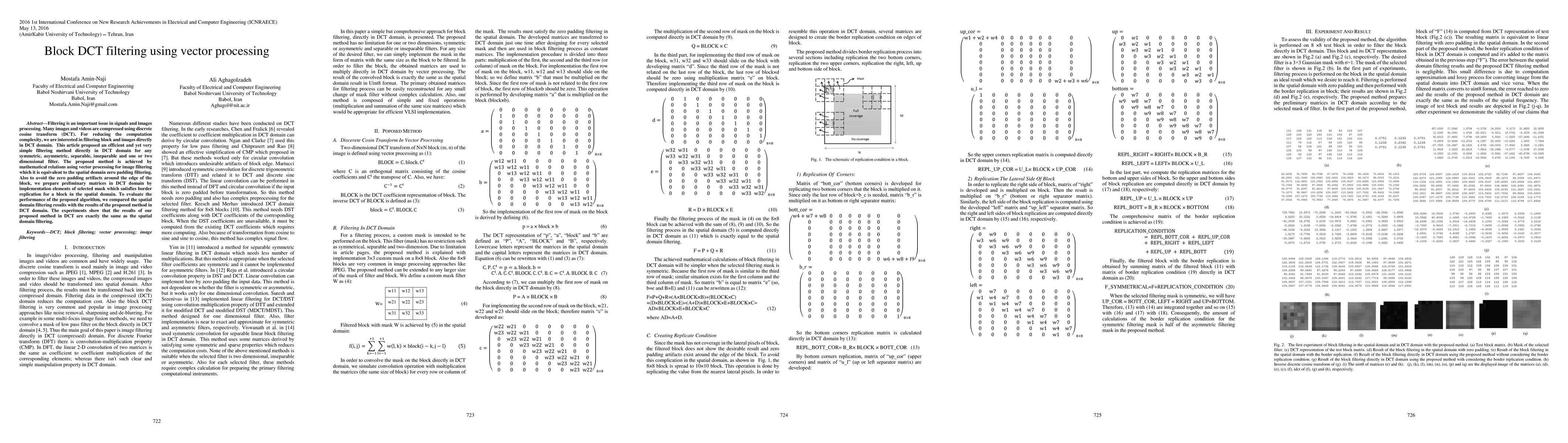 This paper proposes an efficient filtering method in the discrete cosine transform (DCT) domain to reduce computation complexity in image processing. It uses vector processing to achieve results equivalent to spatial domain zero padding filtering, while avoiding edge artifacts by preparing preliminary matrices. Experimental results show that the DCT domain method yields identical outcomes compared to traditional spatial domain filtering.