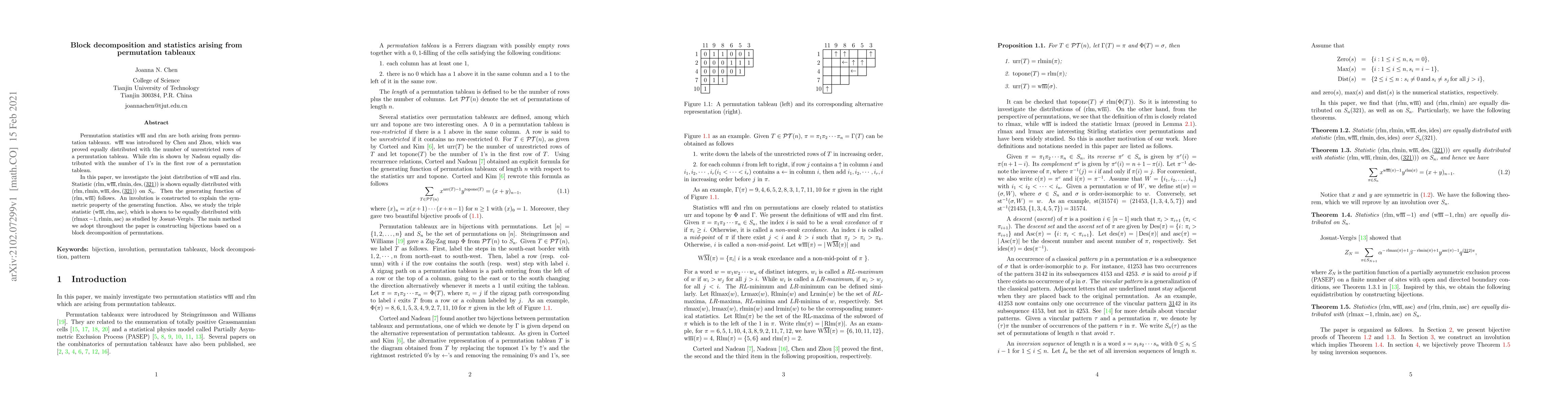 Permutation statistics $\wnm$ and $\rlm$ are both arising from permutation tableaux. $\wnm$ was introduced by Chen and Zhou, which was proved equally distributed with the number of unrestricted rows of a permutation tableau. While $\rlm$ is showed by Nadeau equally distributed with the number of $1$'s in the first row of a permutation tableau. In this paper, we investigate the joint distribution of $\wnm$ and $\rlm$. Statistic $(\rlm,\wnm,\rlmin,\des,(\underline{321}))$ is shown equally distributed with $(\rlm,\rlmin,\wnm,\des,(\underline{321}))$ on $S_n$. Then the generating function of $(\rlm,\wnm)$ follows. An involution is constructed to explain the symmetric property of the generating function. Also, we study the triple statistic $(\wnm,\rlm,\asc)$, which is shown to be equally distributed with $(\rlmax-1,\rlmin,\asc)$ as studied by Josuat-Verg$\grave{e}$s. The main method we adopt throughout the paper is constructing bijections based on a block decomposition of permutations.