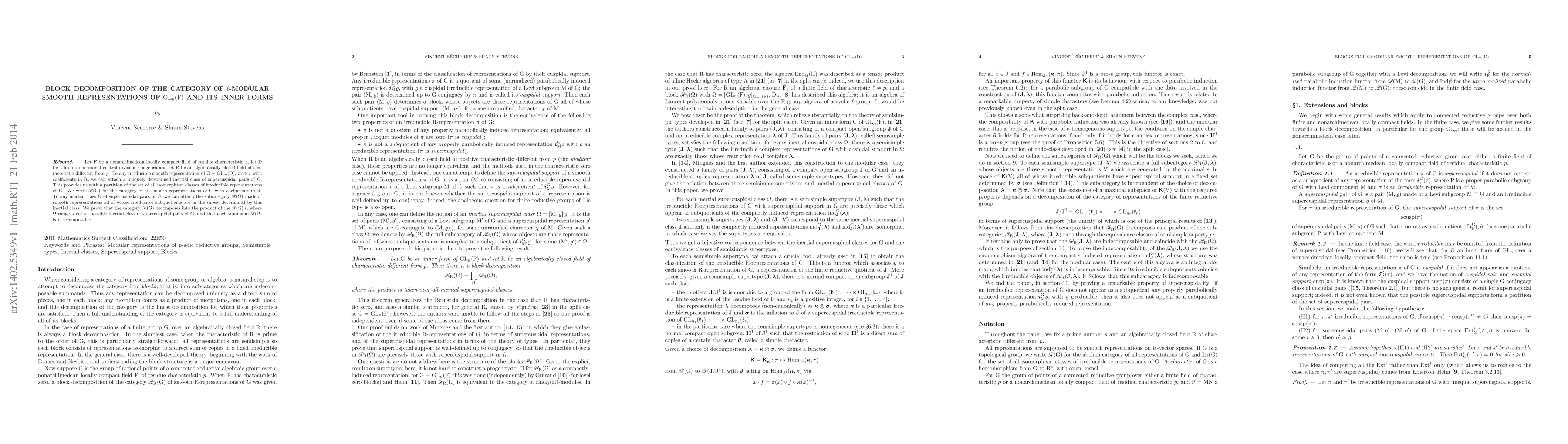 The paper shows that the category of smooth representations of GL(m,D) can be decomposed into a product of subcategories determined by inertial classes of supercuspidal pairs, with each summand being indecomposable. This provides a unique partition of irreducible representations of GL(m,D).