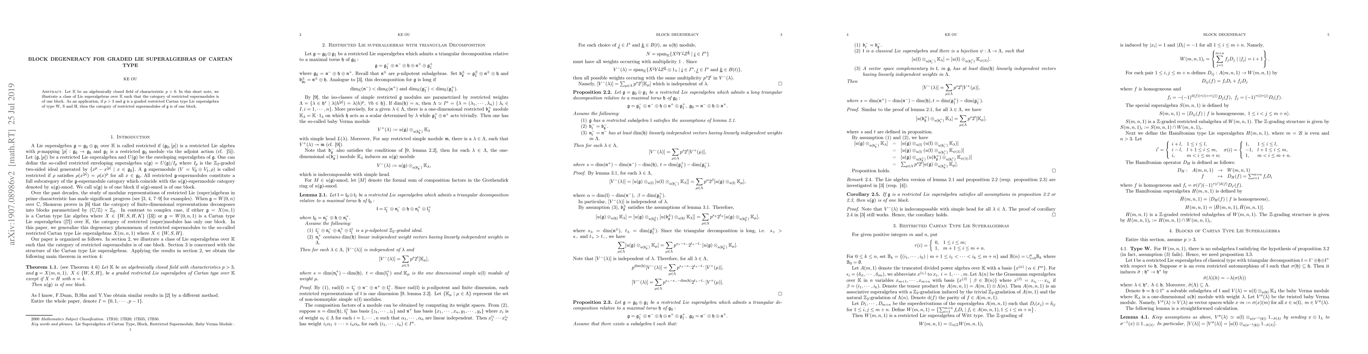 Let $\mathbb{k}$ be an algebraically closed field of characteristic $ p>0. $ In this short note, we illustrate a class of Lie superalgebras over $ \mathbb{k} $ such that the category of restricted supermodules is of one block. As an application, if $ p>3 $ and $ \mathfrak{g} $ is a graded restricted Cartan type Lie superalgebra of type W, S and H, then the category of restricted $ \mathfrak{g} $ supermodules is of one block.