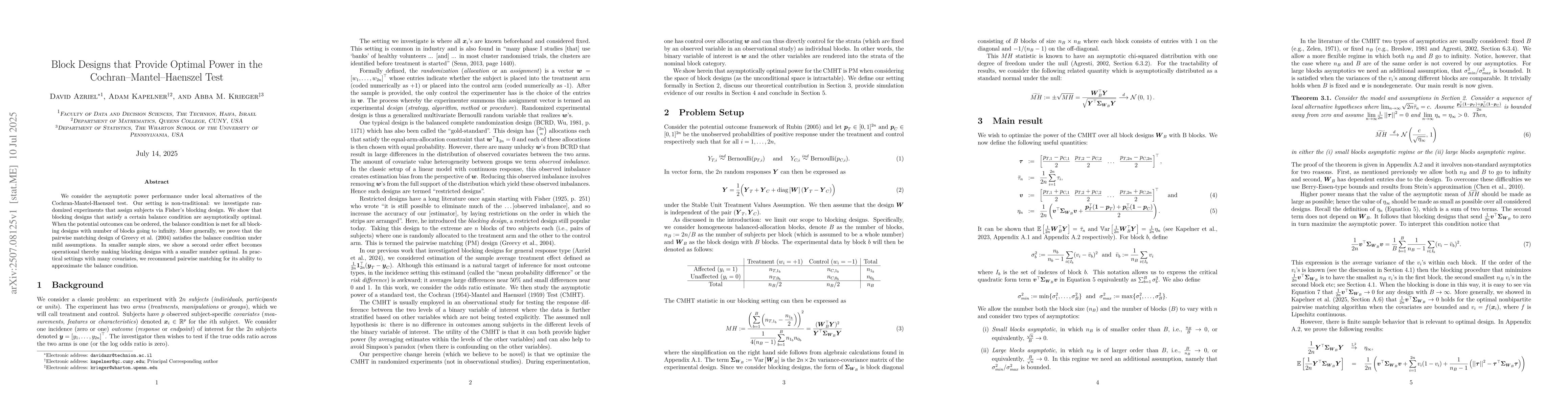 We consider the asymptotic power performance under local alternatives of the Cochran-Mantel-Haenszel test. Our setting is non-traditional: we investigate randomized experiments that assign subjects via Fisher's blocking design. We show that blocking designs that satisfy a certain balance condition are asymptotically optimal. When the potential outcomes can be ordered, the balance condition is met for all blocking designs with number of blocks going to infinity. More generally, we prove that the pairwise matching design of Greevy et al. (2004) satisfies the balance condition under mild assumptions. In smaller sample sizes, we show a second order effect becomes operational thereby making blocking designs with a smaller number optimal. In practical settings with many covariates, we recommend pairwise matching for its ability to approximate the balance condition.