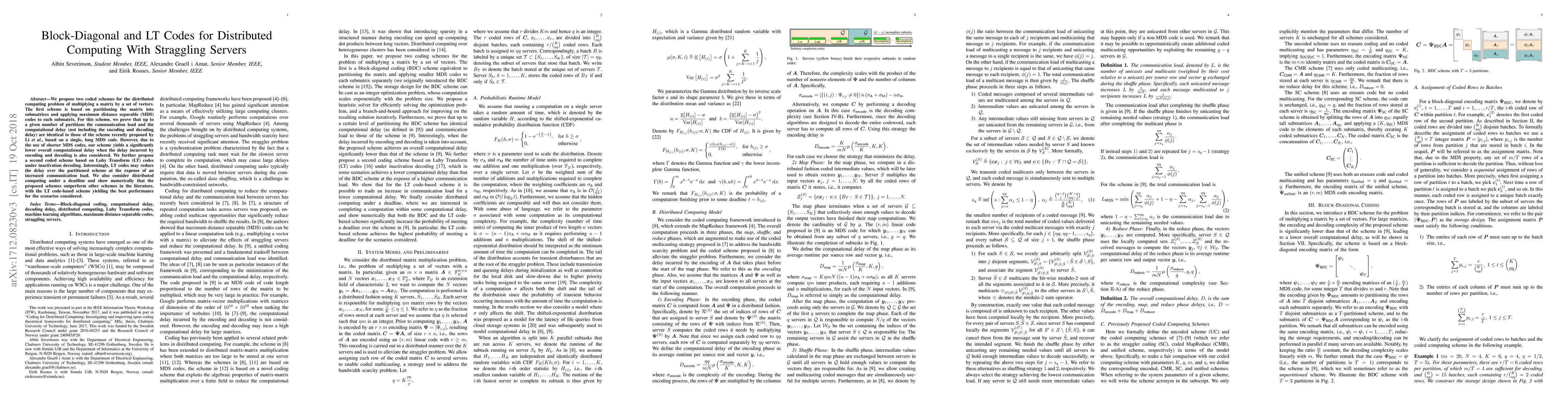 We propose two coded schemes for the distributed computing problem of multiplying a matrix by a set of vectors. The first scheme is based on partitioning the matrix into submatrices and applying maximum distance separable (MDS) codes to each submatrix. For this scheme, we prove that up to a given number of partitions the communication load and the computational delay (not including the encoding and decoding delay) are identical to those of the scheme recently proposed by Li et al., based on a single, long MDS code. However, due to the use of shorter MDS codes, our scheme yields a significantly lower overall computational delay when the delay incurred by encoding and decoding is also considered. We further propose a second coded scheme based on Luby Transform (LT) codes under inactivation decoding. Interestingly, LT codes may reduce the delay over the partitioned scheme at the expense of an increased communication load. We also consider distributed computing under a deadline and show numerically that the proposed schemes outperform other schemes in the literature, with the LT code-based scheme yielding the best performance for the scenarios considered.