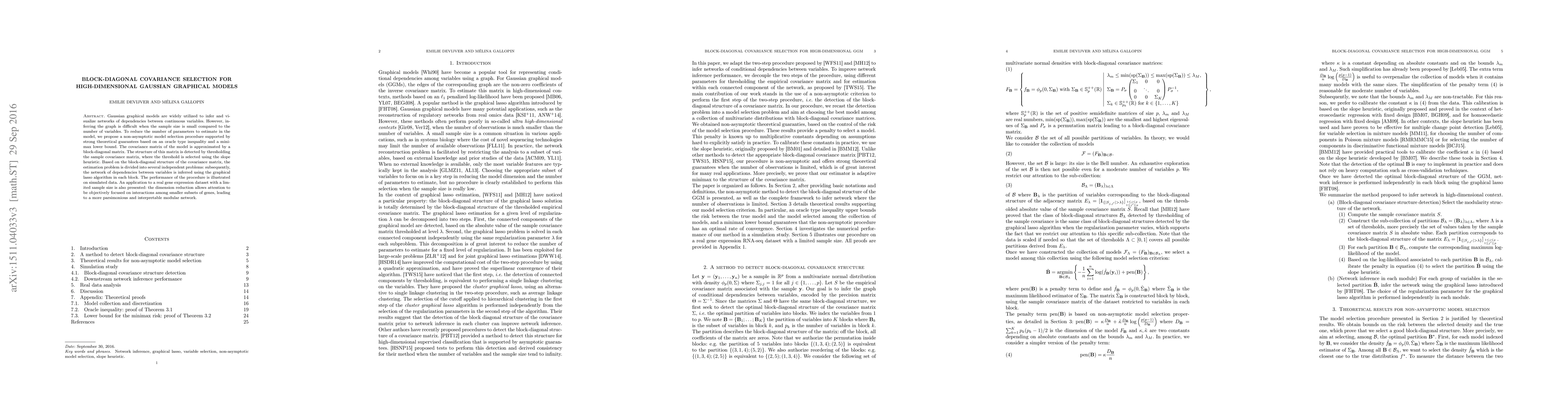 Gaussian graphical models are widely utilized to infer and visualize networks of dependencies between continuous variables. However, inferring the graph is difficult when the sample size is small compared to the number of variables. To reduce the number of parameters to estimate in the model, we propose a non-asymptotic model selection procedure supported by strong theoretical guarantees based on an oracle inequality and a minimax lower bound. The covariance matrix of the model is approximated by a block-diagonal matrix. The structure of this matrix is detected by thresholding the sample covariance matrix, where the threshold is selected using the slope heuristic. Based on the block-diagonal structure of the covariance matrix, the estimation problem is divided into several independent problems: subsequently, the network of dependencies between variables is inferred using the graphical lasso algorithm in each block. The performance of the procedure is illustrated on simulated data. An application to a real gene expression dataset with a limited sample size is also presented: the dimension reduction allows attention to be objectively focused on interactions among smaller subsets of genes, leading to a more parsimonious and interpretable modular network.