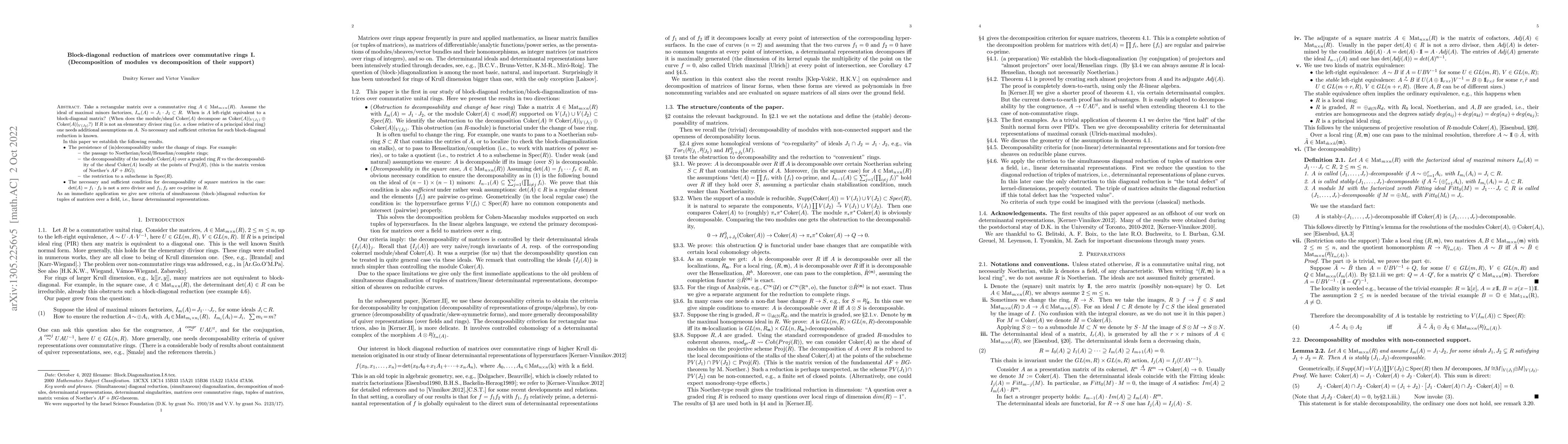 Consider rectangular matrices over a commutative ring R. Assume the ideal of maximal minors factorizes, I_m(A)=J_1*J_2. When is A left-right equivalent to a block-diagonal matrix? (When does the module/sheaf Coker(A) decompose as the corresponding direct sum?) If R is not a principal ideal ring (or a close relative of a PIR) one needs additional assumptions on A. No necessary and sufficient criterion for such block-diagonal reduction is known. In this part we establish the following: * The persistence of (in)decomposability under the change of rings. For example, the passage to Noetherian/local/complete rings, the decomposability of A over a graded ring R vs the decomposability of Coker(A) locally at the points of Proj(R), the restriction to a subscheme in Spec(R). * The necessary and sufficient condition for decomposability of square matrices in the case: det(A)=f_1*f_2 is not a zero divisor and f_1,f_2 are co-prime. As an immediate application we give criteria of simultaneous (block-)diagonal reduction for tuples of matrices over a field, i.e. linear determinantal representations.