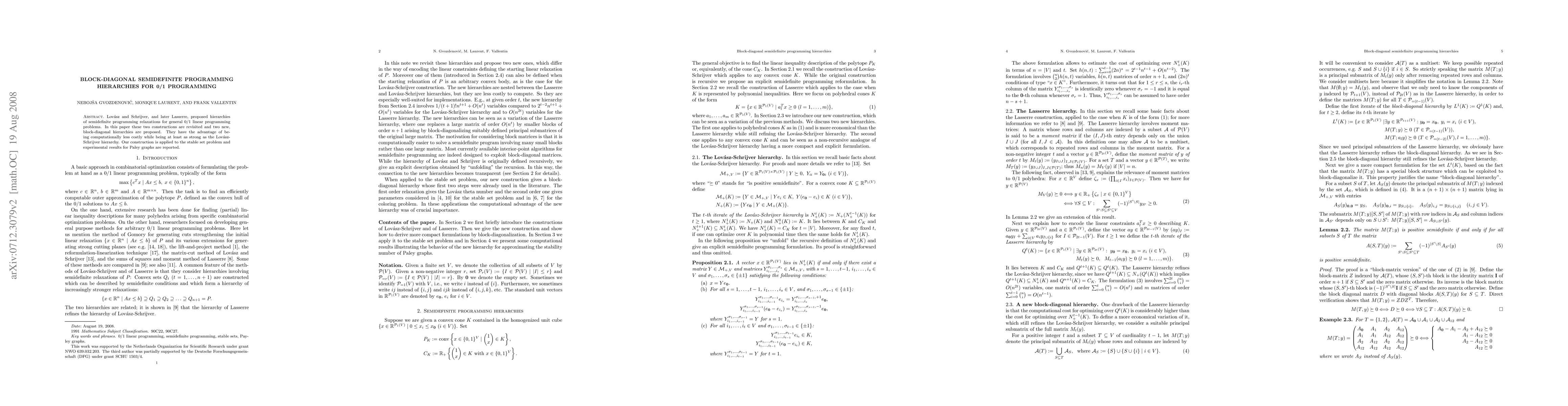 Lovasz and Schrijver, and later Lasserre, proposed hierarchies of semidefinite programming relaxations for general 0/1 linear programming problems. In this paper these two constructions are revisited and two new, block-diagonal hierarchies are proposed. They have the advantage of being computationally less costly while being at least as strong as the Lovasz-Schrijver hierarchy. Our construction is applied to the stable set problem and experimental results for Paley graphs are reported.