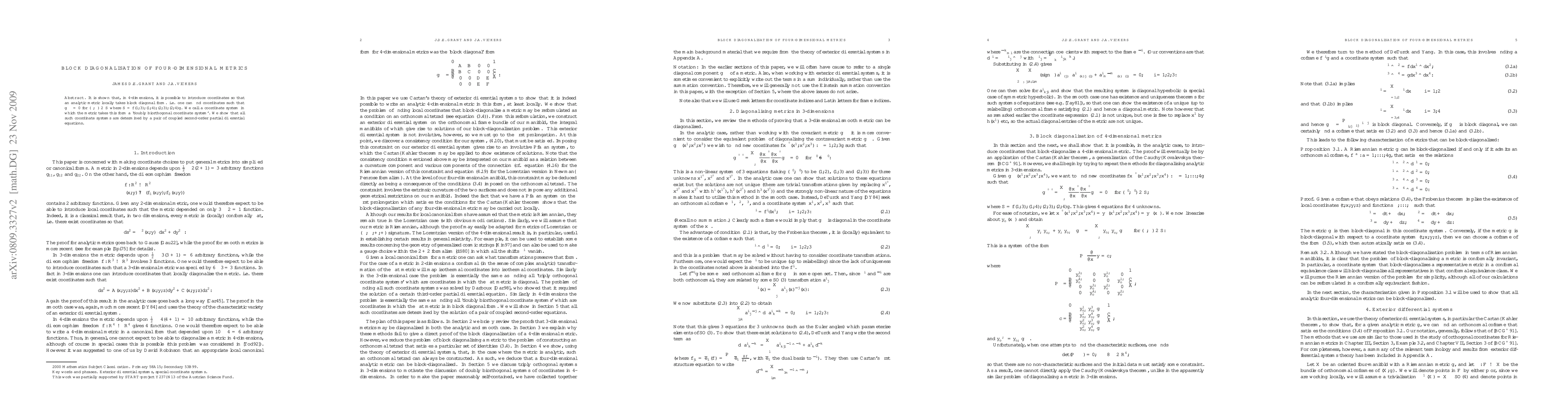 It is shown that, in four dimensions, it is possible to introduce coordinates so that an analytic metric locally takes block diagonal form. i.e. one can find coordinates such that $g_{\alpha\beta} = 0$ for $(\alpha, \beta) \in S$ where $S = {(1, 3), (1, 4), (2, 3), (2, 4)}$. We call a coordinate system in which the metric takes this form a 'doubly biorthogonal coordinate system'. We show that all such coordinate systems are determined by a pair of coupled second-order partial differential equations.