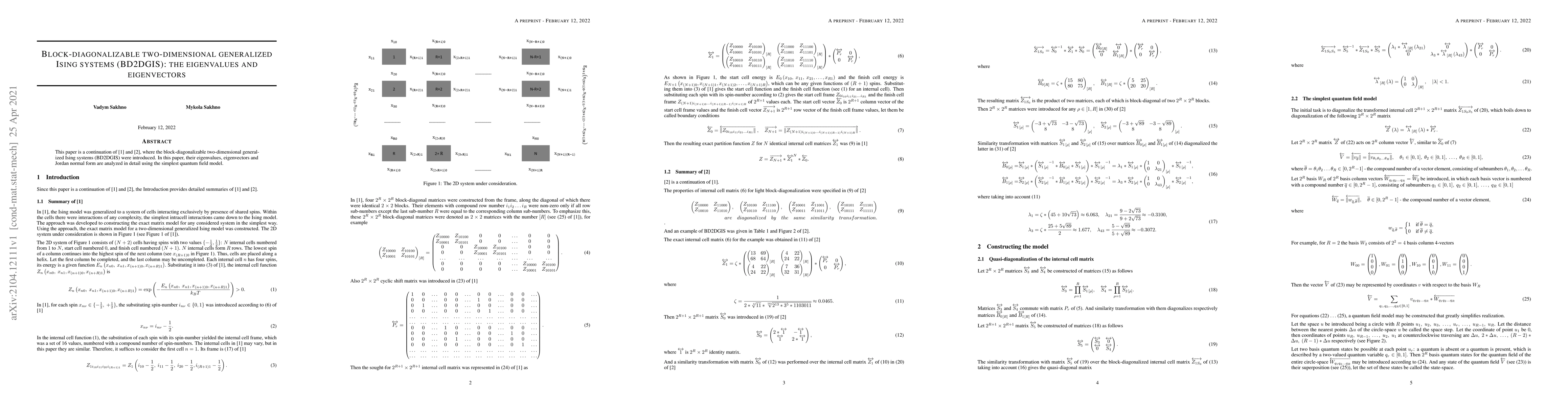 This paper is a continuation of [1] and [2], where the block-diagonalizable two-dimensional generalized Ising systems (BD2DGIS) were introduced. In this paper, their eigenvalues, eigenvectors and Jordan normal form are analyzed in detail using the simplest quantum field model.