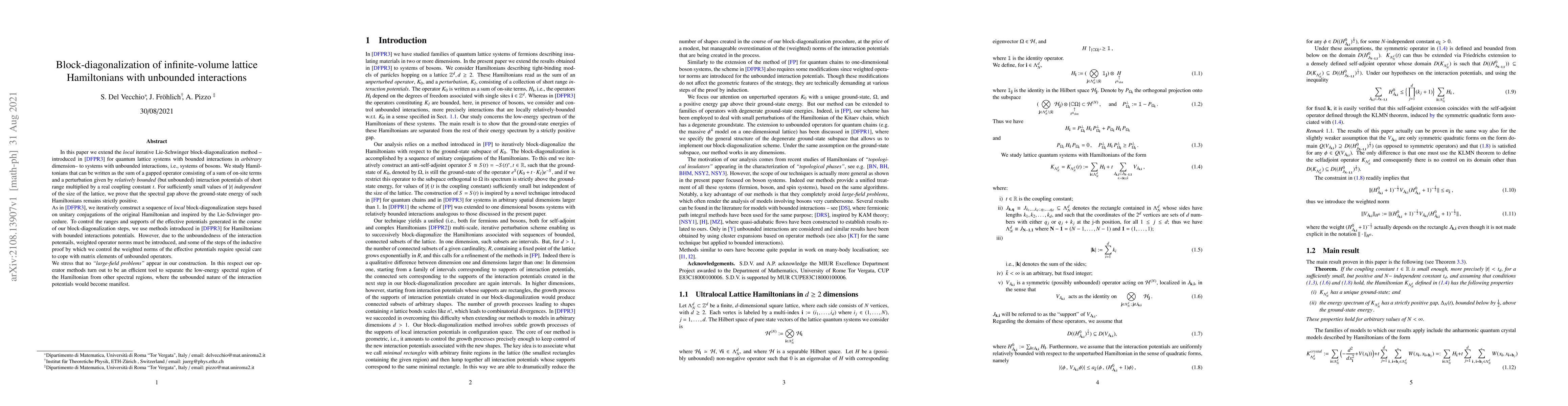 Researchers developed a method to block-diagonalize infinite-volume lattice Hamiltonians with unbounded interactions, proving that the spectral gap above the ground-state energy remains positive for sufficiently small coupling constants.