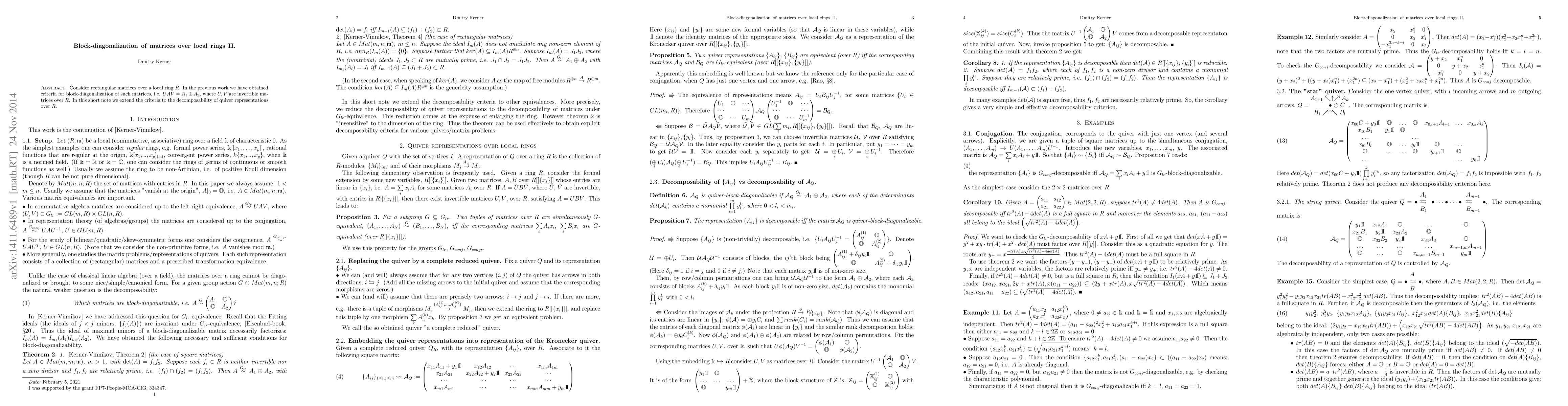 Consider rectangular matrices over a local ring R. In the previous work we have obtained criteria for block-diagonalization of such matrices, i.e. U A V=A_1\oplus A_2, where U,V are invertible matrices over R. In this short note we extend the criteria to the decomposability of quiver representations over R.