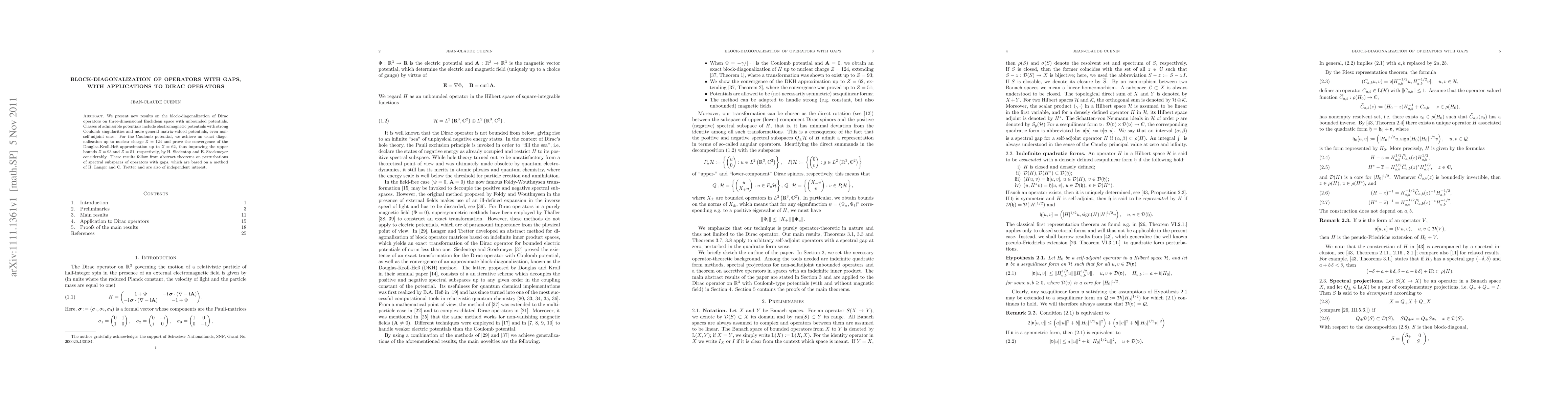 This paper presents new methods for block-diagonalizing Dirac operators in three-dimensional space under various potentials, including strong Coulomb and non-self-adjoint types. It achieves exact diagonalization for Coulomb potentials up to nuclear charge Z=124 and improves convergence bounds for the Douglas-Kroll-Hess approximation.