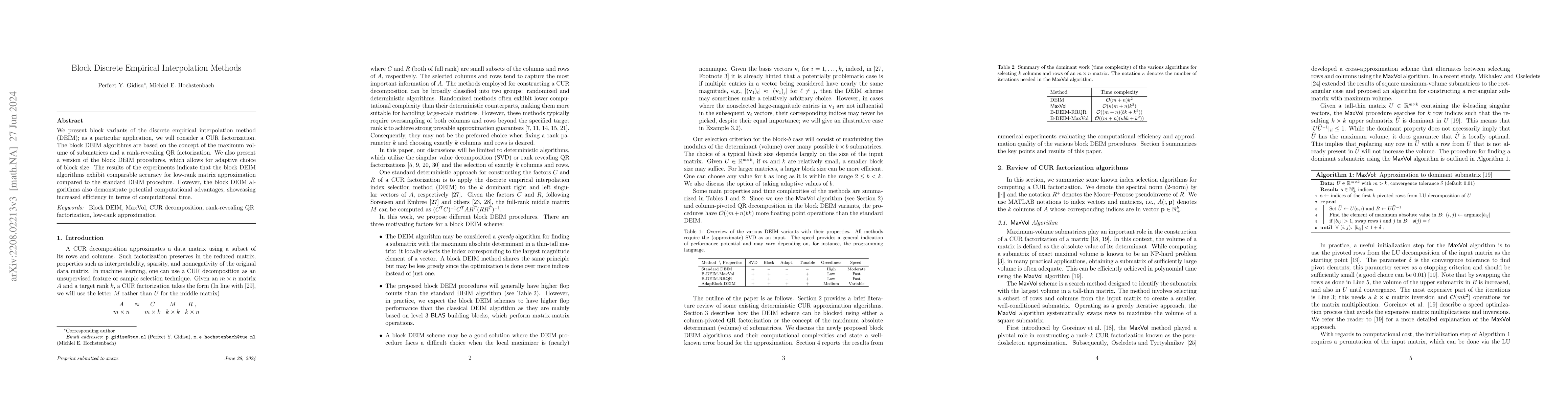 The paper introduces block variants of the discrete empirical interpolation method (DEIM) for CUR factorization, emphasizing computational efficiency via maximum volume submatrices and rank-revealing QR factorization. Experimental results show that while maintaining accuracy, block DEIM methods offer significant computational time improvements.