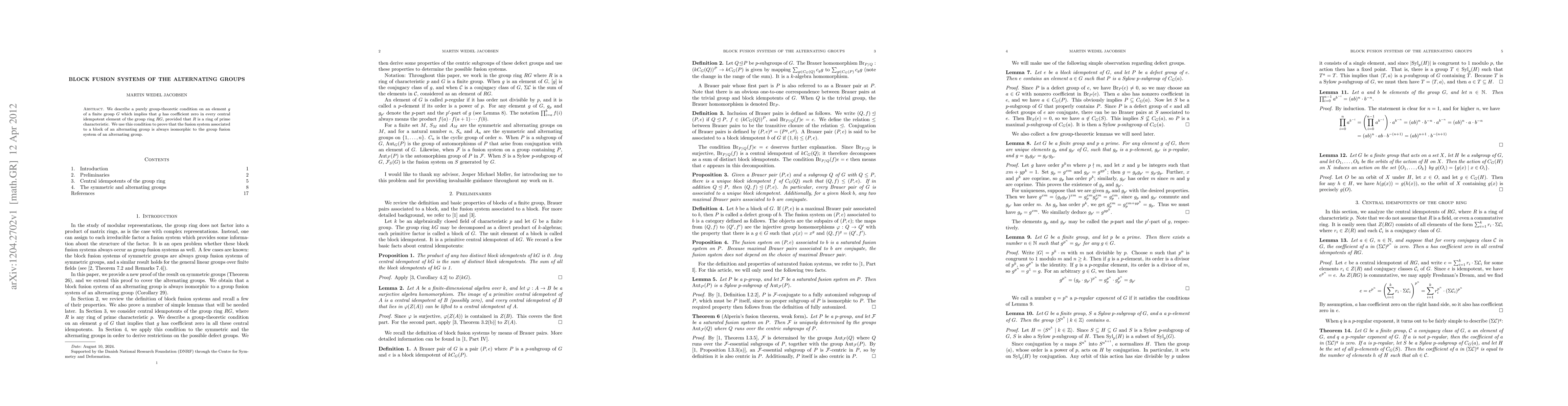 This paper introduces a condition for elements in alternating groups that guarantees coefficient zero in group ring central idempotents, leading to an isomorphism between block fusion systems of alternating groups.