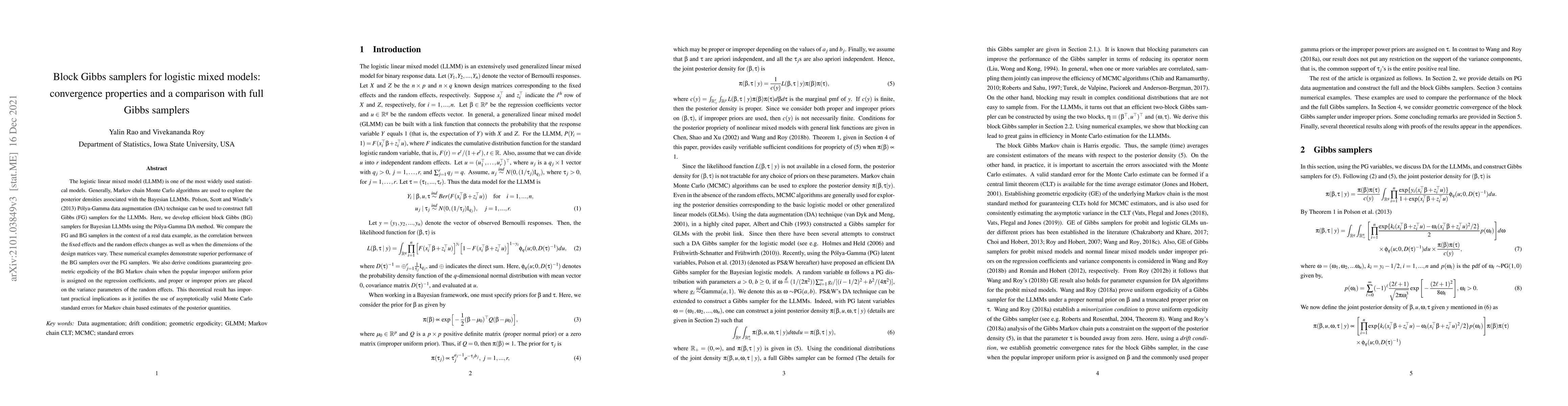 This paper develops block Gibbs (BG) samplers for Bayesian logistic linear mixed models (LLMMs) using the Polya-Gamma data augmentation technique and compares their performance to full Gibbs (FG) samplers. The BG samplers show superior performance in numerical examples, and the paper also proves conditions for their geometric ergodicity, supporting the use of Monte Carlo standard errors.