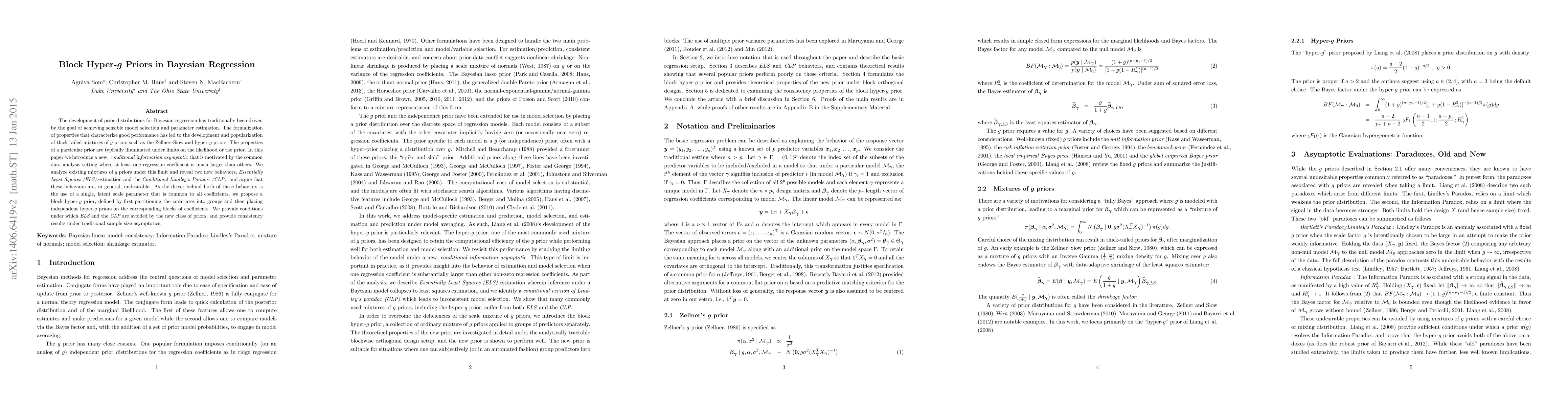 This paper introduces a new 'block hyper-g' prior in Bayesian regression to avoid undesirable estimation behaviors identified in existing priors. The 'block hyper-g' prior partitions covariates into groups and applies independent hyper-g priors to corresponding coefficient blocks, avoiding Essentially Least Squares (ELS) estimation and the Conditional Lindley's Paradox (CLP) under certain conditions, while ensuring consistency with traditional sample size asymptotics.