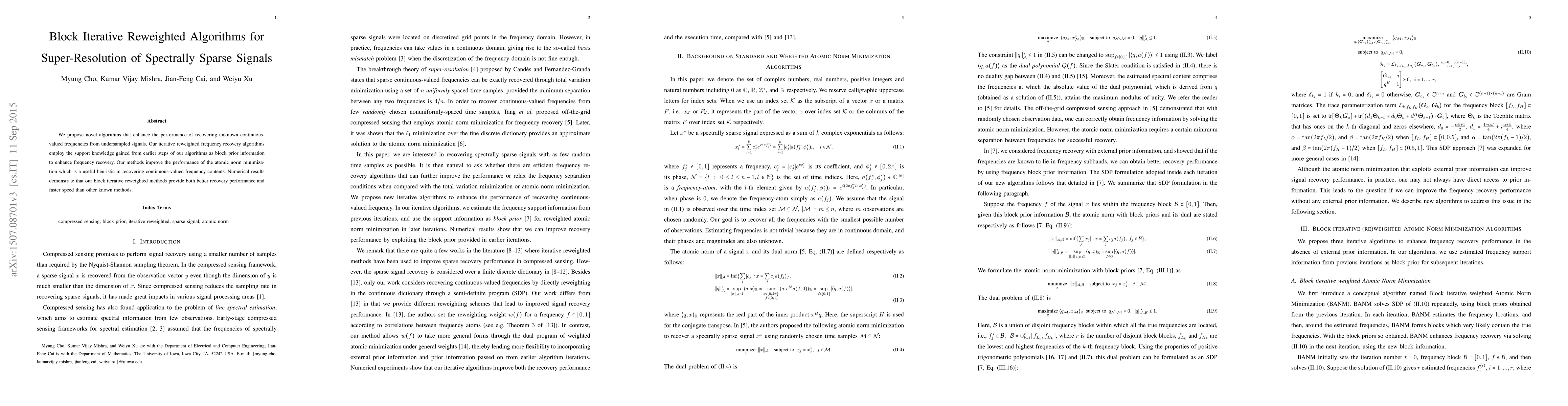 This paper proposes new block iterative reweighted algorithms to improve the recovery of continuous-valued frequencies from undersampled signals. These methods enhance atomic norm minimization using support knowledge from earlier steps, resulting in better recovery performance and faster speed compared to existing techniques.