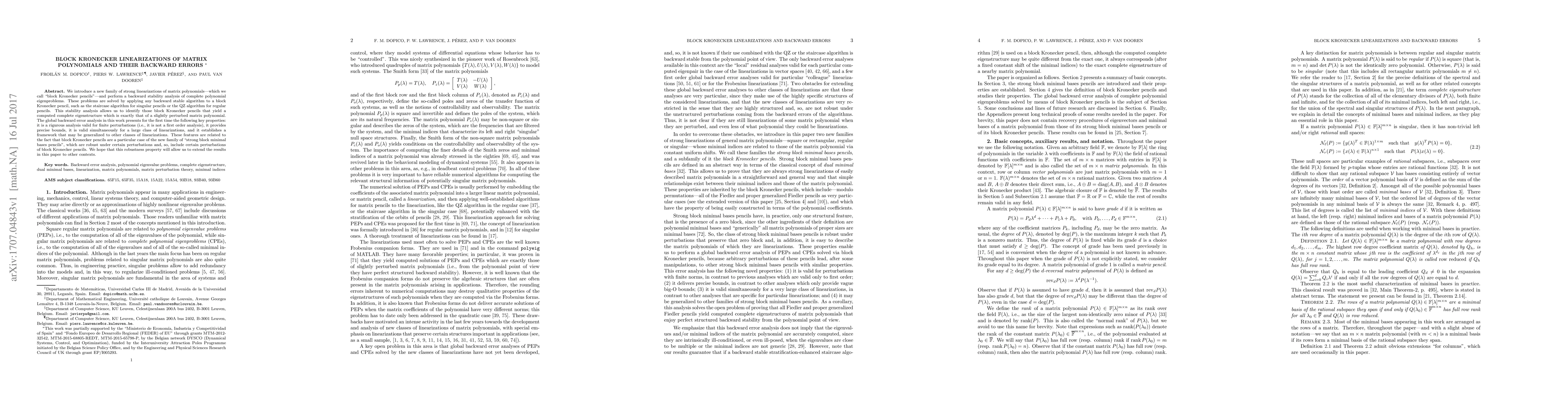 This paper introduces "block Kronecker pencils" as a novel family of linearizations for matrix polynomials, followed by a rigorous backward stability analysis that identifies which linearizations yield exact eigenstructures for slightly perturbed matrix polynomials. The analysis provides precise bounds and establishes a framework applicable to a wide range of linearizations, highlighting the robustness of these pencils under certain perturbations.