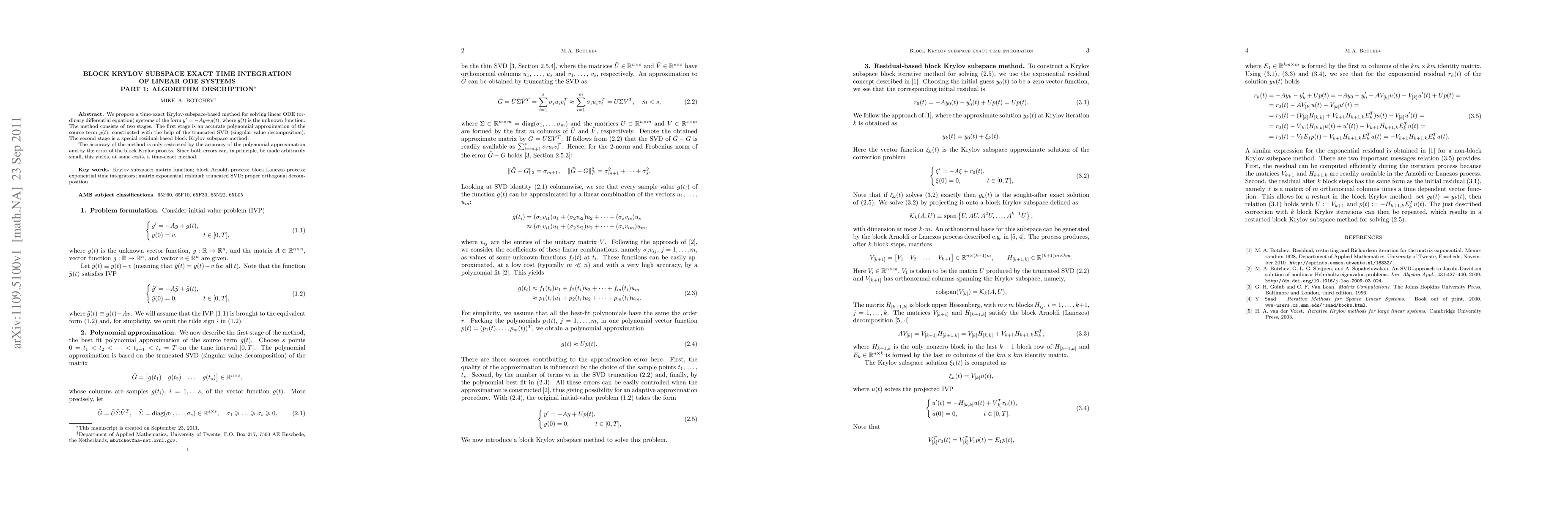 We propose a time-exact Krylov-subspace-based method for solving linear ODE (ordinary differential equation) systems of the form $y'=-Ay + g(t)$, where $y(t)$ is the unknown function. The method consists of two stages. The first stage is an accurate polynomial approximation of the source term $g(t)$, constructed with the help of the truncated SVD (singular value decomposition). The second stage is a special residual-based block Krylov subspace method. The accuracy of the method is only restricted by the accuracy of the polynomial approximation and by the error of the block Krylov process. Since both errors can, in principle, be made arbitrarily small, this yields, at some costs, a time-exact method.