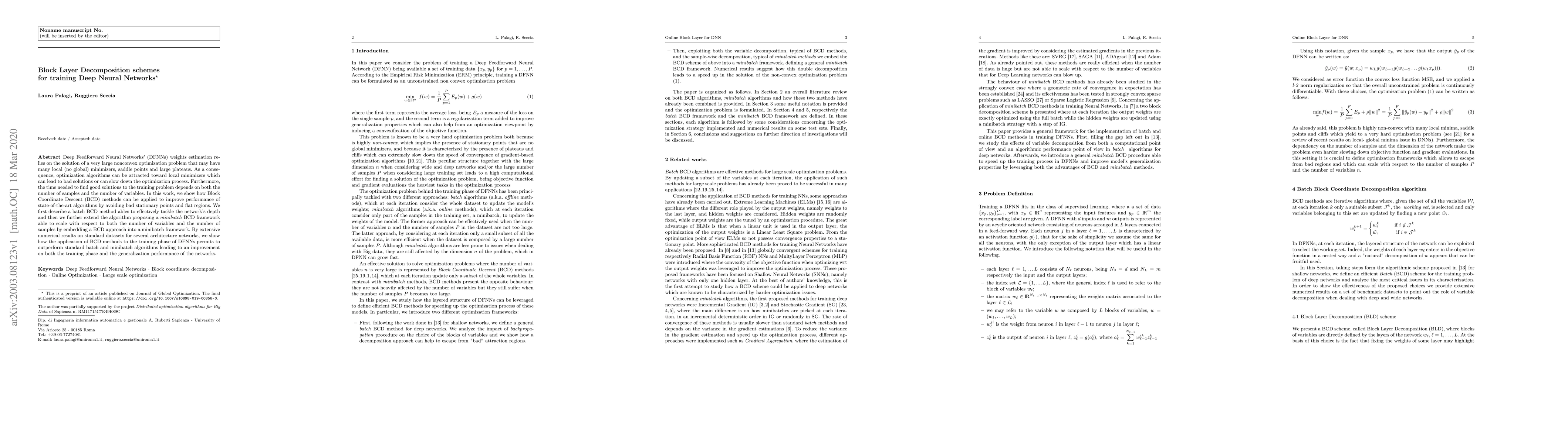 Deep Feedforward Neural Networks' (DFNNs) weights estimation relies on the solution of a very large nonconvex optimization problem that may have many local (no global) minimizers, saddle points and large plateaus. As a consequence, optimization algorithms can be attracted toward local minimizers which can lead to bad solutions or can slow down the optimization process. Furthermore, the time needed to find good solutions to the training problem depends on both the number of samples and the number of variables. In this work, we show how Block Coordinate Descent (BCD) methods can be applied to improve performance of state-of-the-art algorithms by avoiding bad stationary points and flat regions. We first describe a batch BCD method ables to effectively tackle the network's depth and then we further extend the algorithm proposing a \textit{minibatch} BCD framework able to scale with respect to both the number of variables and the number of samples by embedding a BCD approach into a minibatch framework. By extensive numerical results on standard datasets for several architecture networks, we show how the application of BCD methods to the training phase of DFNNs permits to outperform standard batch and minibatch algorithms leading to an improvement on both the training phase and the generalization performance of the networks.