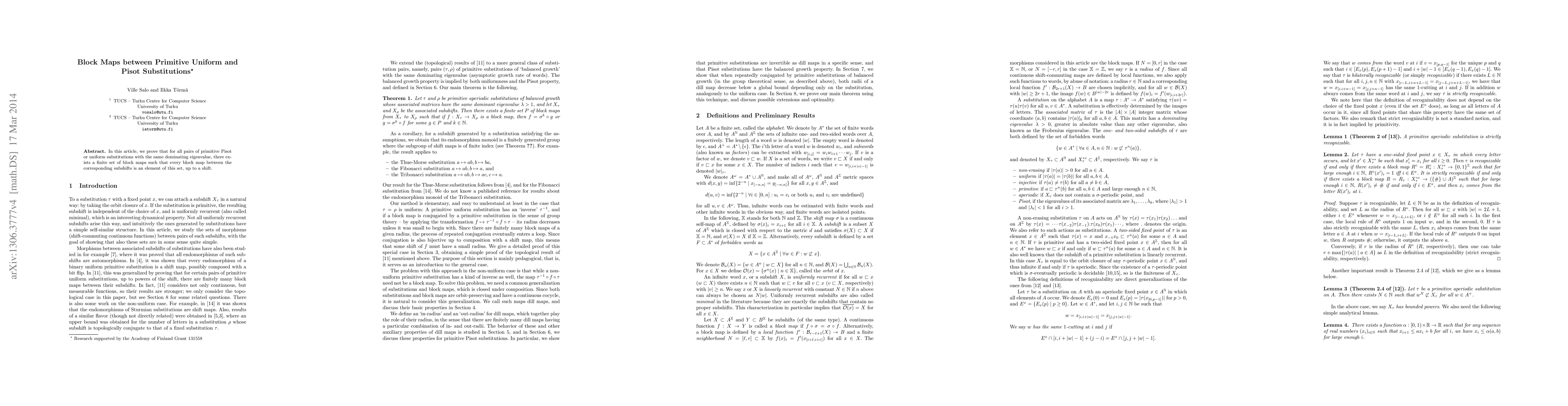 This paper demonstrates that for pairs of primitive Pisot or uniform substitutions sharing the same dominant eigenvalue, there exists a finite set of block maps that can represent all transitions between corresponding subshifts, up to a shift. This establishes a structured relationship between these types of substitutions.
