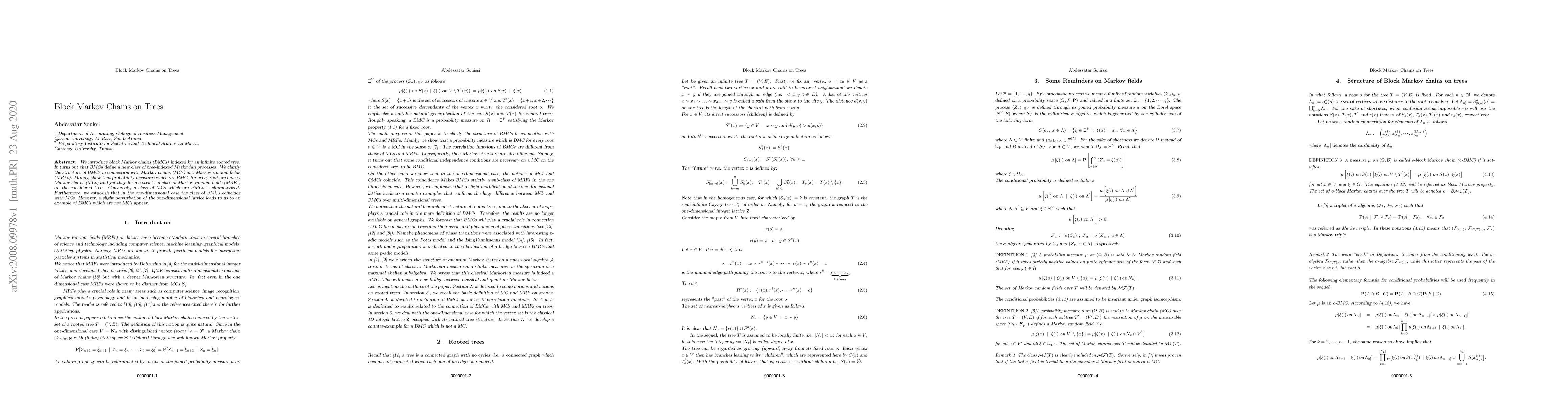 This paper introduces block Markov chains (BMCs) on infinite rooted trees, establishing them as a distinct class of tree-indexed Markovian processes. It clarifies the relationship between BMCs, Markov chains (MCs), and Markov random fields (MRFs), showing that BMCs form a subclass of MRFs while still being MCs, except in perturbed one-dimensional lattices where they diverge from traditional MCs.