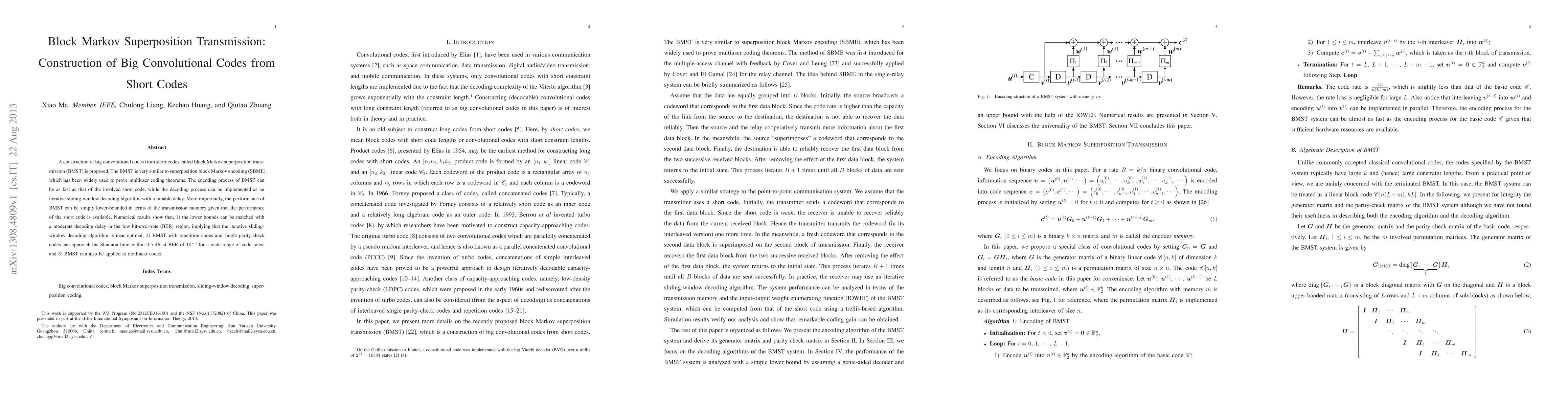 The paper proposes block Markov superposition transmission (BMST) for constructing large convolutional codes from smaller ones, offering fast encoding and tunable decoding delay. BMST achieves near-optimal performance with low bit-error-rate and can approach the Shannon limit, demonstrating its applicability to various codes including nonlinear ones.
