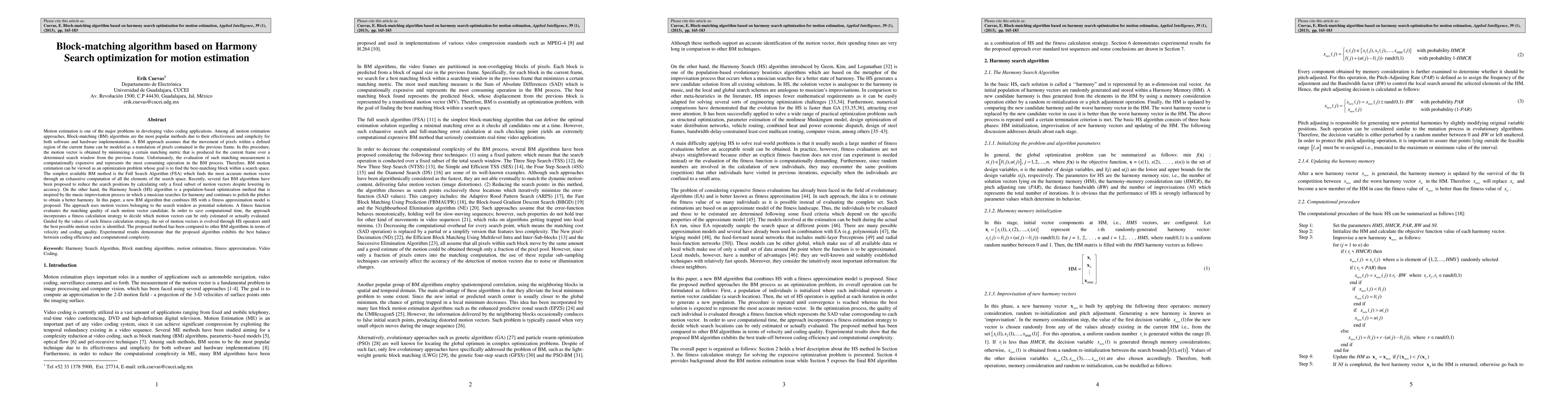 Motion estimation is one of the major problems in developing video coding applications. Among all motion estimation approaches, Block-matching (BM) algorithms are the most popular methods due to their effectiveness and simplicity for both software and hardware implementations. A BM approach assumes that the movement of pixels within a defined region of the current frame can be modeled as a translation of pixels contained in the previous frame. In this procedure, the motion vector is obtained by minimizing a certain matching metric that is produced for the current frame over a determined search window from the previous frame. Unfortunately, the evaluation of such matching measurement is computationally expensive and represents the most consuming operation in the BM process. Therefore, BM motion estimation can be viewed as an optimization problem whose goal is to find the best-matching block within a search space. The simplest available BM method is the Full Search Algorithm (FSA) which finds the most accurate motion vector through an exhaustive computation of all the elements of the search space. Recently, several fast BM algorithms have been proposed to reduce the search positions by calculating only a fixed subset of motion vectors despite lowering its accuracy. On the other hand, the Harmony Search (HS) algorithm is a population-based optimization method that is inspired by the music improvisation process in which a musician searches for harmony and continues to polish the pitches to obtain a better harmony. In this paper, a new BM algorithm that combines HS with a fitness approximation model is proposed. The approach uses motion vectors belonging to the search window as potential solutions. A fitness function evaluates the matching quality of each motion vector candidate.