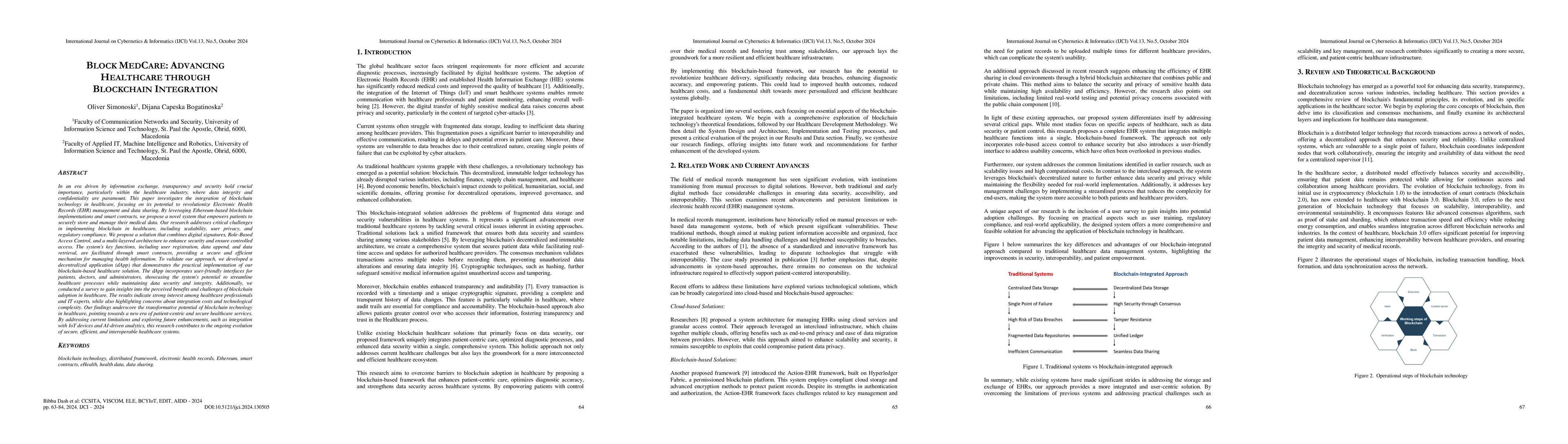 In an era driven by information exchange, transparency and security hold crucial importance, particularly within the healthcare industry, where data integrity and confidentiality are paramount. This paper investigates the integration of blockchain technology in healthcare, focusing on its potential to revolutionize Electronic Health Records (EHR) management and data sharing. By leveraging Ethereum-based blockchain implementations and smart contracts, we propose a novel system that empowers patients to securely store and manage their medical data. Our research addresses critical challenges in implementing blockchain in healthcare, including scalability, user privacy, and regulatory compliance. We propose a solution that combines digital signatures, Role-Based Access Control, and a multi-layered architecture to enhance security and ensure controlled access. The system's key functions, including user registration, data append, and data retrieval, are facilitated through smart contracts, providing a secure and efficient mechanism for managing health information. To validate our approach, we developed a decentralized application (dApp) that demonstrates the practical implementation of our blockchain-based healthcare solution. The dApp incorporates user-friendly interfaces for patients, doctors, and administrators, showcasing the system's potential to streamline healthcare processes while maintaining data security and integrity. Additionally, we conducted a survey to gain insights into the perceived benefits and challenges of blockchain adoption in healthcare. The results indicate strong interest among healthcare professionals and IT experts, while also highlighting concerns about integration costs and technological complexity. Our findings...