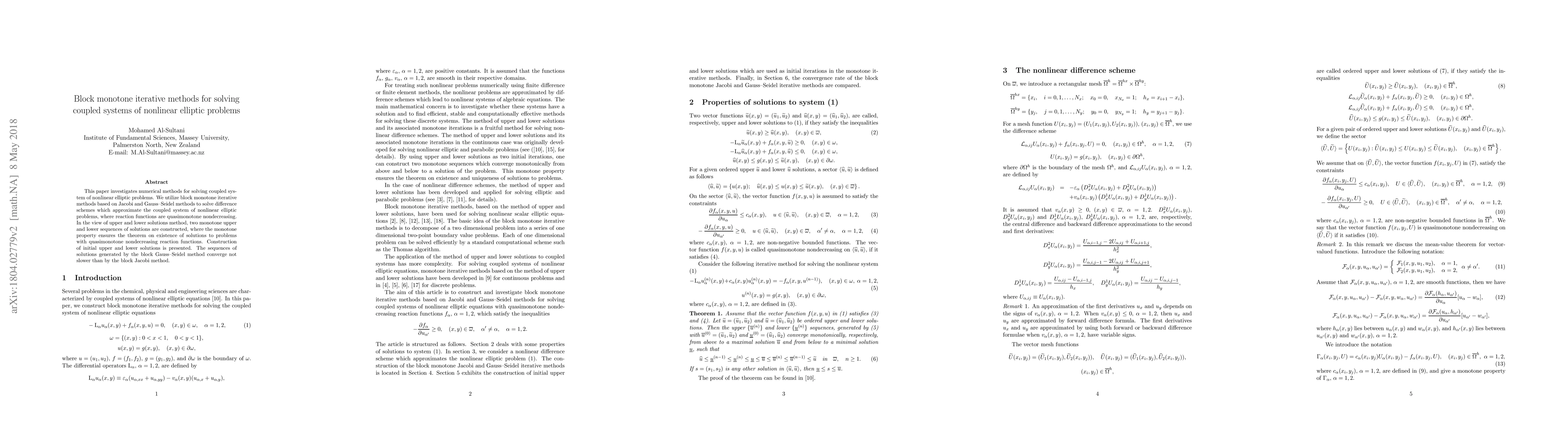 This paper explores block monotone iterative methods, based on Jacobi and Gauss-Seidel techniques, to solve coupled nonlinear elliptic problems. It constructs monotone upper and lower sequences ensuring solution existence for quasimonotone nondecreasing reactions, with the block Gauss-Seidel method showing comparable convergence to the block Jacobi method.