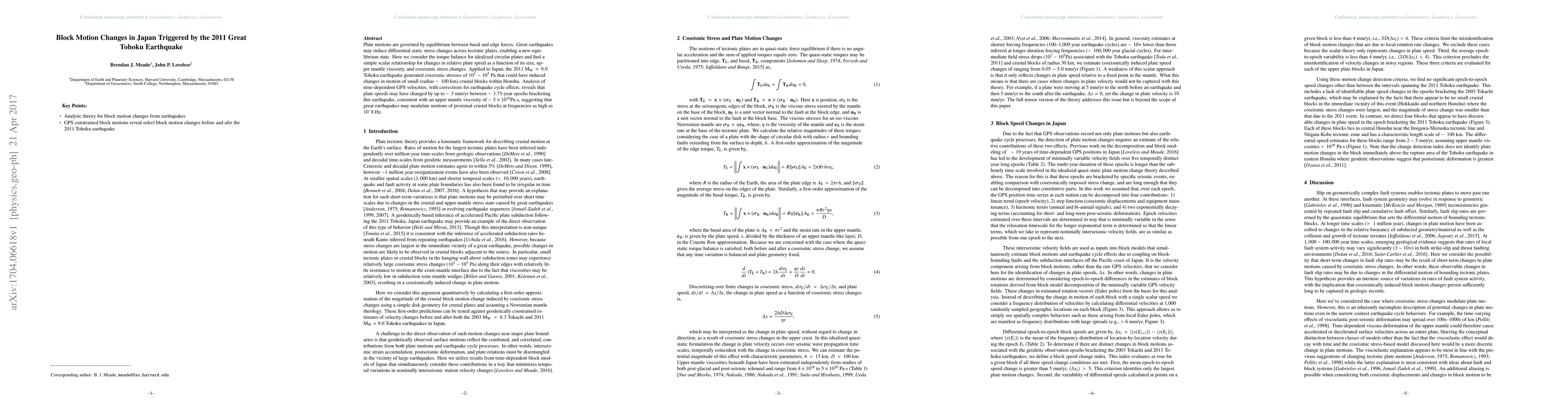This study investigates how the 2011 Great Tohoku earthquake in Japan altered the motion of tectonic plates, finding that the earthquake induced significant stress changes that may have modified the speed of small crustal blocks within Honshu. GPS velocity data analysis suggests that the plate speed could have changed by up to 3 mm/yr, indicating that great earthquakes can modulate crustal block motions at high frequencies.
