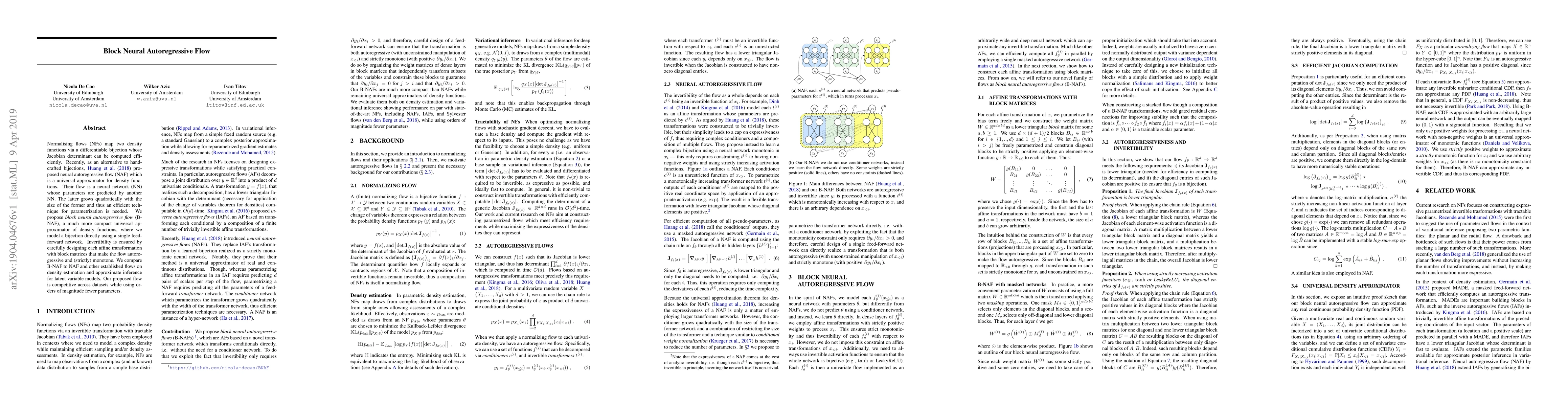 The paper proposes block neural autoregressive flow (B-NAF) as a more efficient alternative to neural autoregressive flow (NAF) for density estimation. B-NAF uses a single feed-forward network with block matrices to ensure invertibility and autoregressive properties, significantly reducing the number of parameters while maintaining competitive performance.