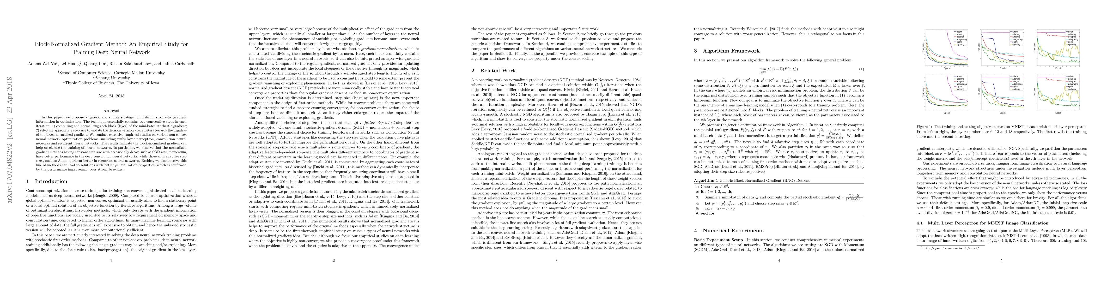 This paper proposes a block-normalized gradient method to optimize deep neural networks, showing it accelerates training and improves generalization. The method normalizes gradients per layer and uses adaptive step sizes, achieving better results in convolutional and recurrent networks compared to baselines.
