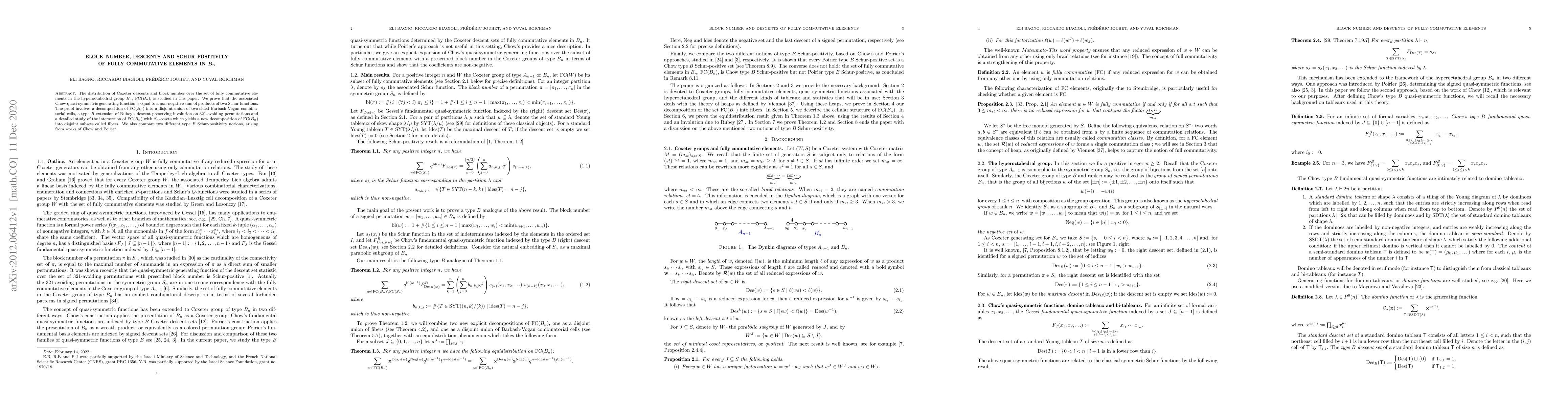 The distribution of Coxeter descents and block number over the set of fully commutative elements in the hyperoctahedral group $B_n$, $\FC(B_n)$, is studied in this paper. We prove that the associated Chow quasi-symmetric generating function is equal to a non-negative sum of products of two Schur functions. The proof involves a decomposition of $\FC(B_n)$ into a disjoint union of two-sided Barbash-Vogan combinatorial cells, a type $B$ extension of Rubey's descent preserving involution on $321$-avoiding permutations and a detailed study of the intersection of $\FC(B_n)$ with $S_n$-cosets which yields a new decomposition of $\FC(B_n)$ into disjoint subsets called fibers. We also compare two different type $B$ Schur-positivity notions, arising from works of Chow and Poirier
