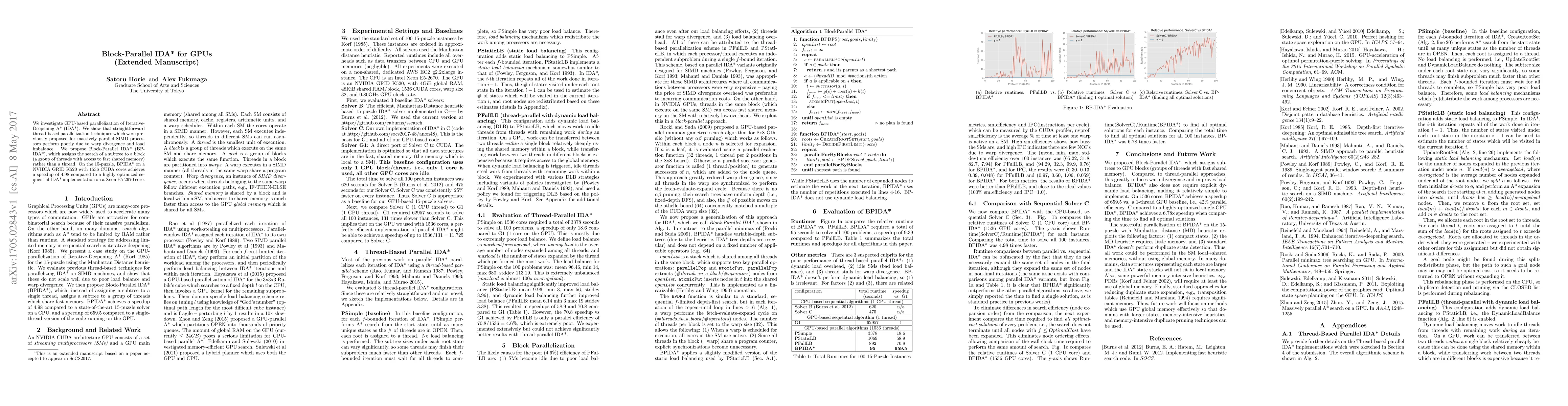 The paper explores GPU acceleration for Iterative-Deepening A* (IDA*), addressing poor performance of thread-based parallelization due to warp divergence and load imbalance. The proposed Block-Parallel IDA* (BPIDA*) assigns subtree search to a block of threads with shared memory, achieving a 4.98x speedup on the 15-puzzle using a NVIDIA GRID K520 compared to a high-performance sequential IDA* implementation.