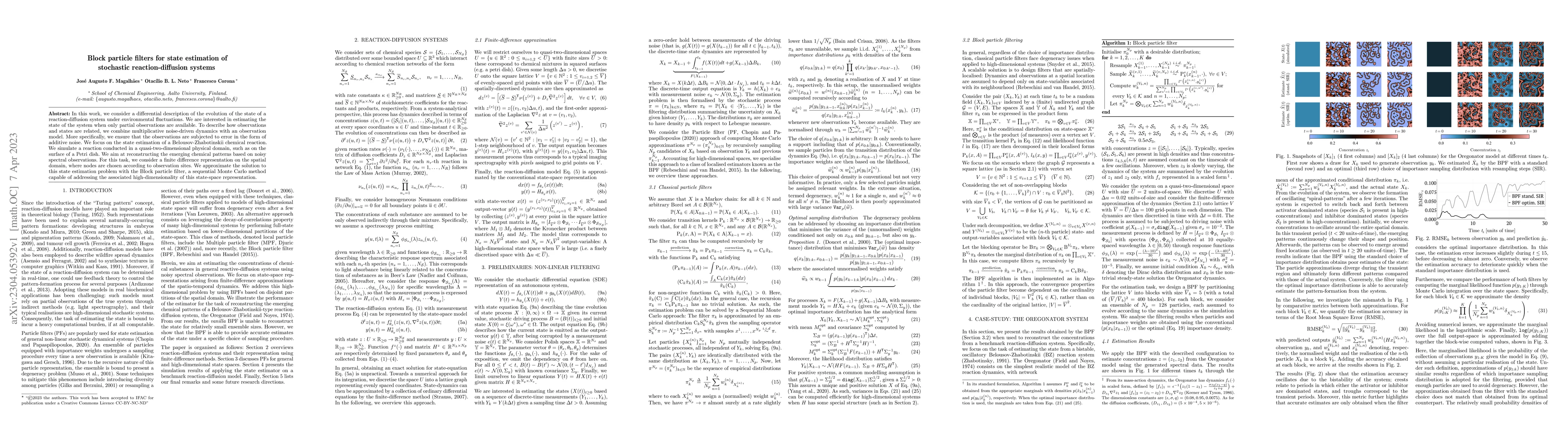 This paper proposes using Block particle filters for estimating the state of stochastic reaction-diffusion systems, specifically focusing on the Belousov-Zhabotinskii chemical reaction. The authors simulate quasi-two-dimensional reactions and aim to reconstruct chemical patterns from noisy spectral observations using a finite difference representation.