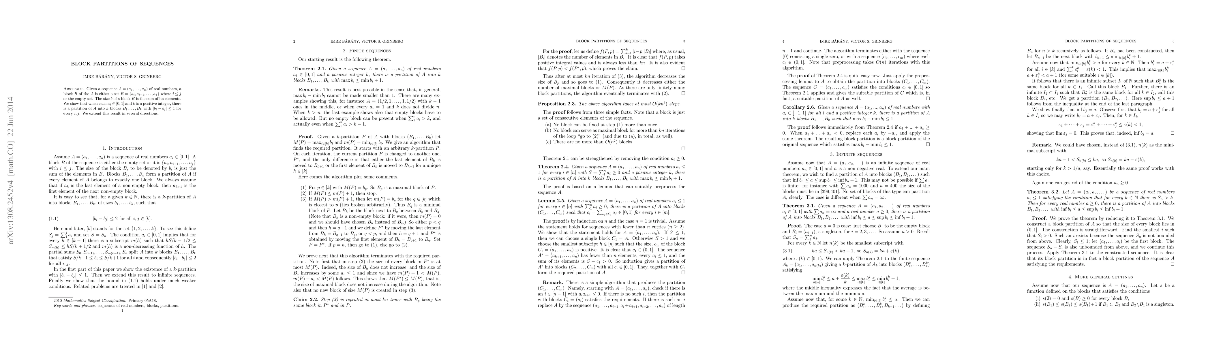 Given a sequence A=(a1,...,an) of real numbers, a block B of the A is either a set B={ai,...,aj} where i<=j or the empty set. The size b of a block B is the sum of its elements. We show that when 0<=ai<=1 and k is a positive integer, there is a partition of A into k blocks B1,...,Bk with |bi-bj|<=1 for every i, j. We extend this result in many directions.