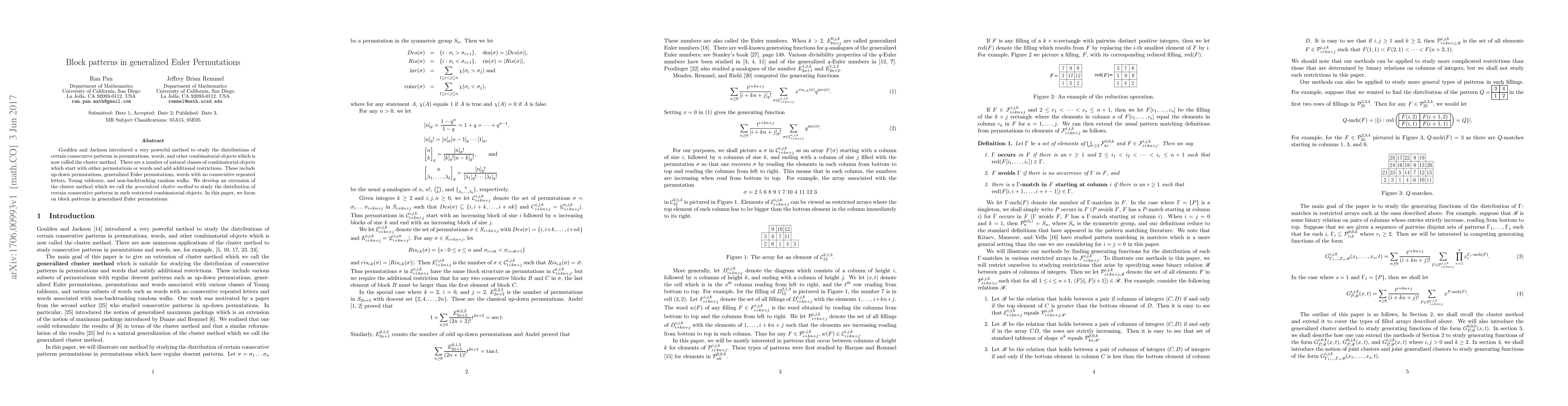 This paper extends the cluster method to analyze block patterns in generalized Euler permutations, introducing a generalized cluster method to study restricted combinatorial objects like Euler permutations. The study aims to understand the distribution of specific consecutive patterns within these permutations.