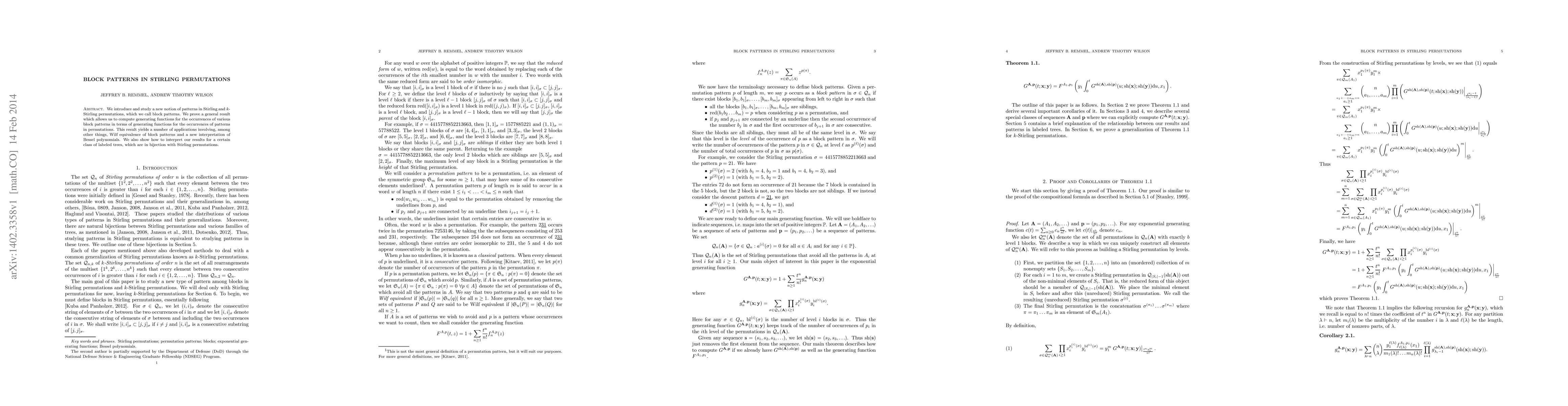 The paper introduces "block patterns" in Stirling and $k$-Stirling permutations, proving a method to compute their generating functions and demonstrating applications including Wilf equivalence and a new view of Bessel polynomials, alongside connections to labeled trees.