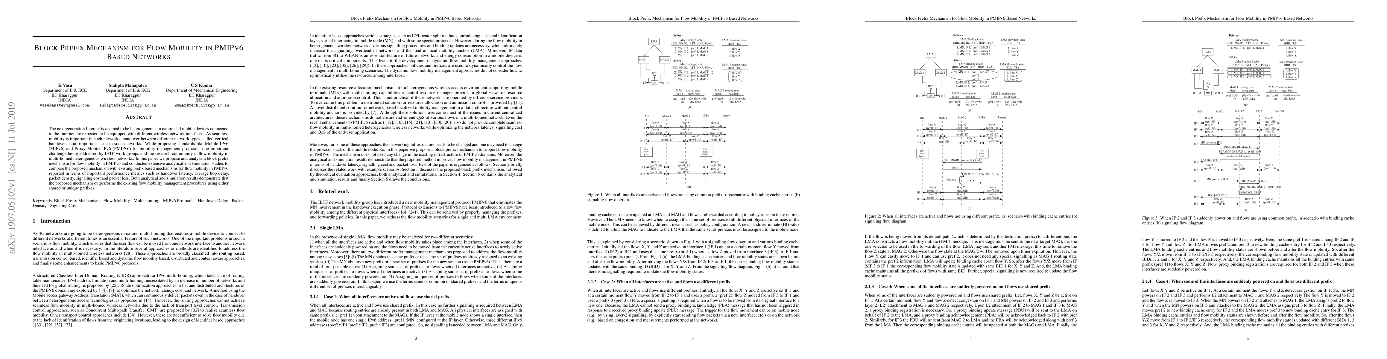 The next generation Internet is deemed to be heterogeneous in nature and mobile devices connected to the Internet are expected to be equipped with different wireless network interfaces. As seamless mobility is important in such networks, handover between different network types, called vertical handover, is an important issue in such networks. While proposing standards like Mobile IPv6 (MIPv6) and Proxy Mobile IPv6 (PMIPv6) for mobility management protocols, one important challenge being addressed by IETF work groups and the research community is flow mobility in multi-homed heterogeneous wireless networks. In this paper we propose and analyze a block prefix mechanism for flow mobility in PMIPv6 and conducted extensive analytical and simulation studies to compare the proposed mechanism with existing prefix based mechanisms for flow mobility in PMIPv6 reported in terms of important performance metrics such as handover latency, average hop delay, packet density, signaling cost and packet loss. Both analytical and simulation results demonstrate that the proposed mechanism outperforms the existing flow mobility management procedures using either shared or unique prefixes.