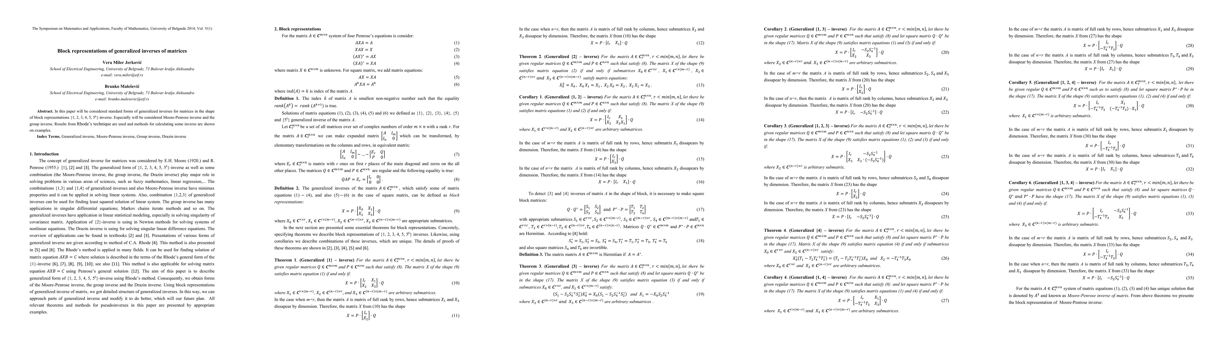 In this paper will be considered standard forms of generalized inverses for matrices in the shape of block representations {1, 2, 3, 4, 5, 5^k}-inverse. Especially will be considered Moore-Penrose inverse and the group inverse. Results from Rhode's technique are used and methods for calculating some inverse are shown on examples.