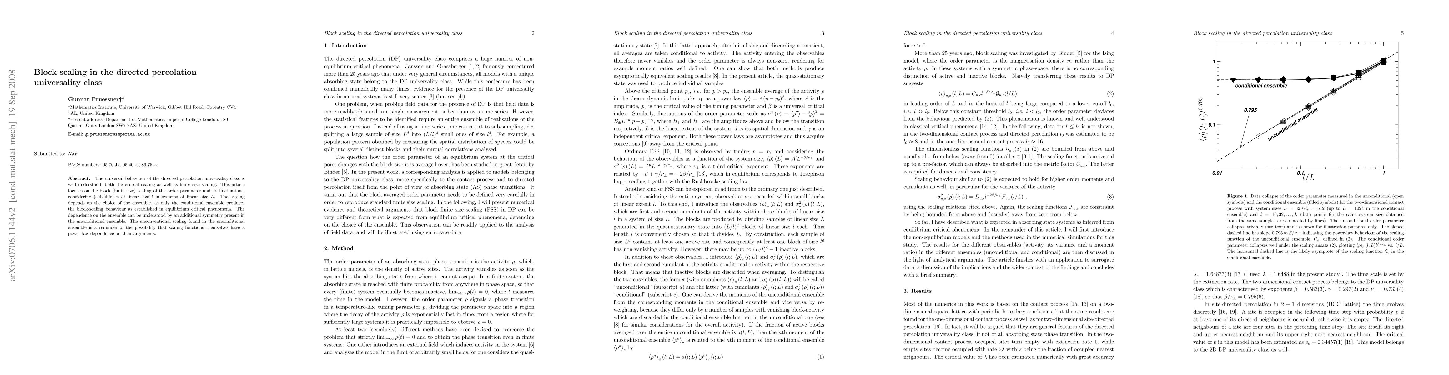 The universal behaviour of the directed percolation universality class is well understood, both the critical scaling as well as finite size scaling. This article focuses on the block (finite size) scaling of the order parameter and its fluctuations, considering (sub-)blocks of linear size l in systems of linear size L. The scaling depends on the choice of the ensemble, as only the conditional ensemble produces the block-scaling behaviour as established in equilibrium critical phenomena. The dependence on the ensemble can be understood by an additional symmetry present in the unconditional ensemble. The unconventional scaling found in the unconditional ensemble is a reminder of the possibility that scaling functions themselves have a power-law dependence on their arguments.