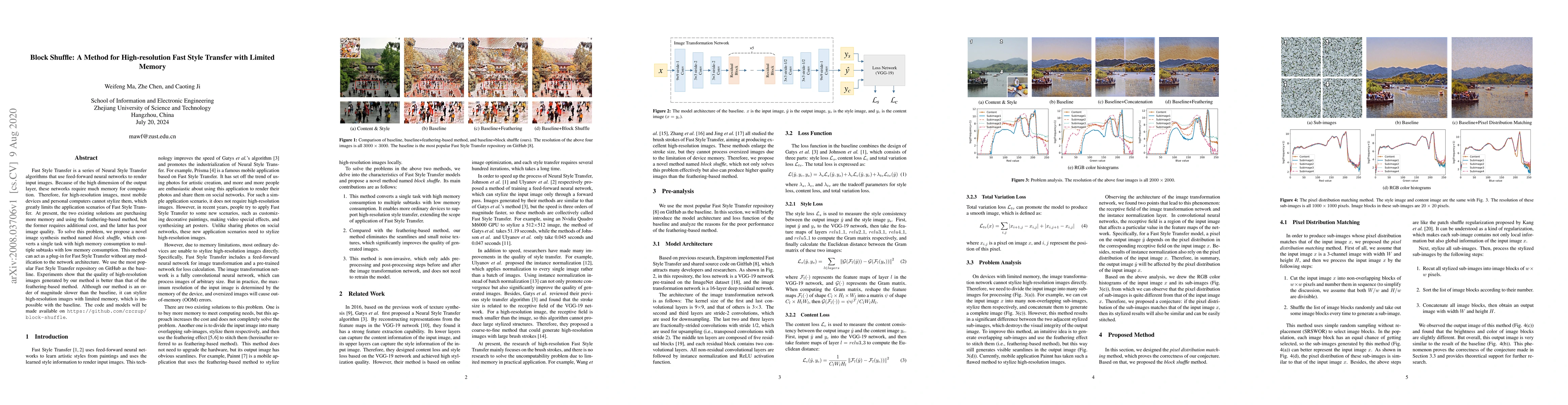 Fast Style Transfer is a series of Neural Style Transfer algorithms that use feed-forward neural networks to render input images. Because of the high dimension of the output layer, these networks require much memory for computation. Therefore, for high-resolution images, most mobile devices and personal computers cannot stylize them, which greatly limits the application scenarios of Fast Style Transfer. At present, the two existing solutions are purchasing more memory and using the feathering-based method, but the former requires additional cost, and the latter has poor image quality. To solve this problem, we propose a novel image synthesis method named \emph{block shuffle}, which converts a single task with high memory consumption to multiple subtasks with low memory consumption. This method can act as a plug-in for Fast Style Transfer without any modification to the network architecture. We use the most popular Fast Style Transfer repository on GitHub as the baseline. Experiments show that the quality of high-resolution images generated by our method is better than that of the feathering-based method. Although our method is an order of magnitude slower than the baseline, it can stylize high-resolution images with limited memory, which is impossible with the baseline. The code and models will be made available on \url{https://github.com/czczup/block-shuffle}.