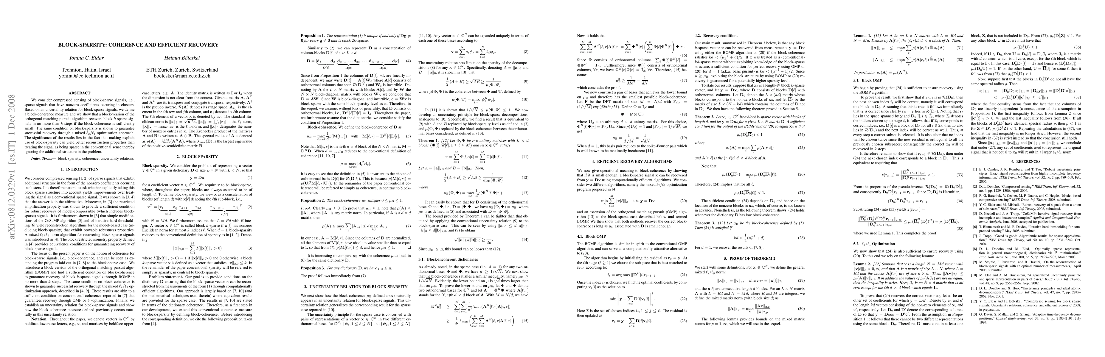 This paper explores compressed sensing for block-sparse signals, introducing a block-coherence measure and demonstrating that efficient recovery can be achieved in fewer steps than traditional sparse recovery methods. It shows that both the block-version of the orthogonal matching pursuit algorithm and a mixed l2/l1 optimization approach can successfully reconstruct block-sparse signals under certain block-sparsity conditions.