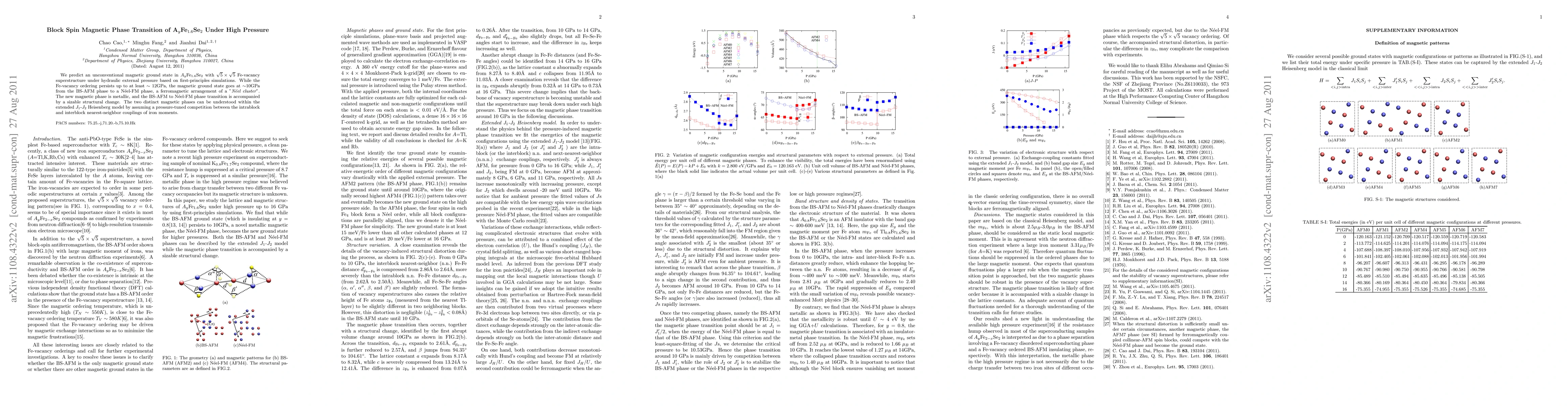 This study predicts an unconventional magnetic phase transition in A$_y$Fe$_{1.6}$Se$_2$ under high pressure, transitioning from a block spin antiferromagnetic (BS-AFM) phase to a Néel-ferromagnetic (Néel-FM) phase at around 10GPa, accompanied by a structural change and metallic behavior. The transition is explained by a pressure-tuned competition between intrablock and interblock iron moment couplings.