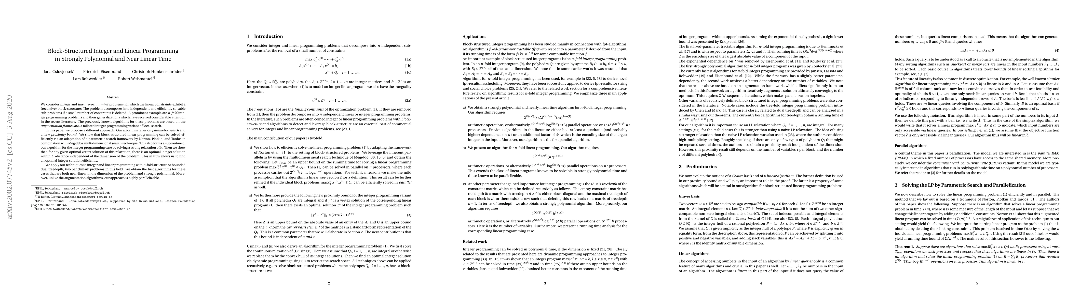 This paper proposes a novel algorithm for solving integer and linear programming problems with block-structured constraints, utilizing parametric search and multidimensional search techniques. The approach achieves near-linear time complexity and strong polynomiality, and is highly parallelizable, contrasting with previous augmentation-based methods.