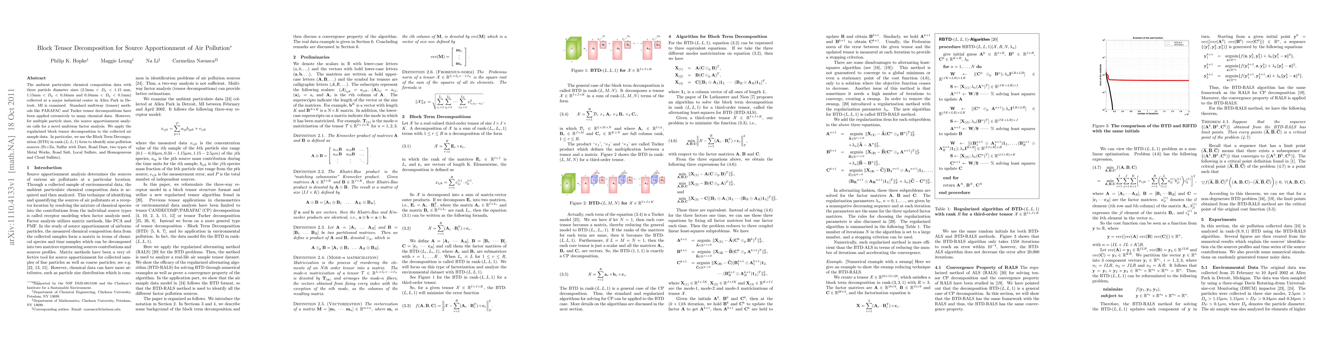 This research applies regularized block tensor decomposition, specifically Block Term Decomposition (BTD), to analyze air pollution data from Allen Park in Detroit, MI, identifying nine pollution sources, unlike traditional tensor methods like PARAFAC.